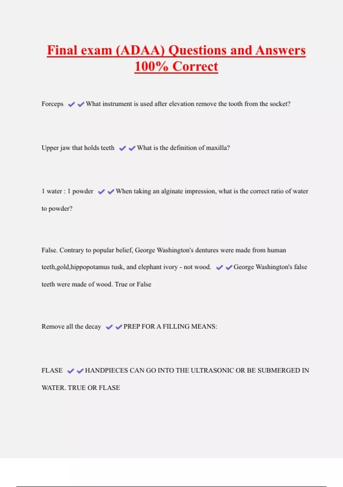 Final exam (ADAA) Questions and Answers 100% Correct Forceps What instrument is used after elevation remove the tooth from the socket? Upper jaw that holds teeth What is the definition of maxilla? 1 water : 1 powder When taking an alginate impression, what is the correct ratio of water to powder? False. Contrary to popular belief, George Washington's dentures were made from human teeth,gold,hippopotamus tusk, and elephant ivory - not wood. George Washington's false teeth were made of wood. True or False
