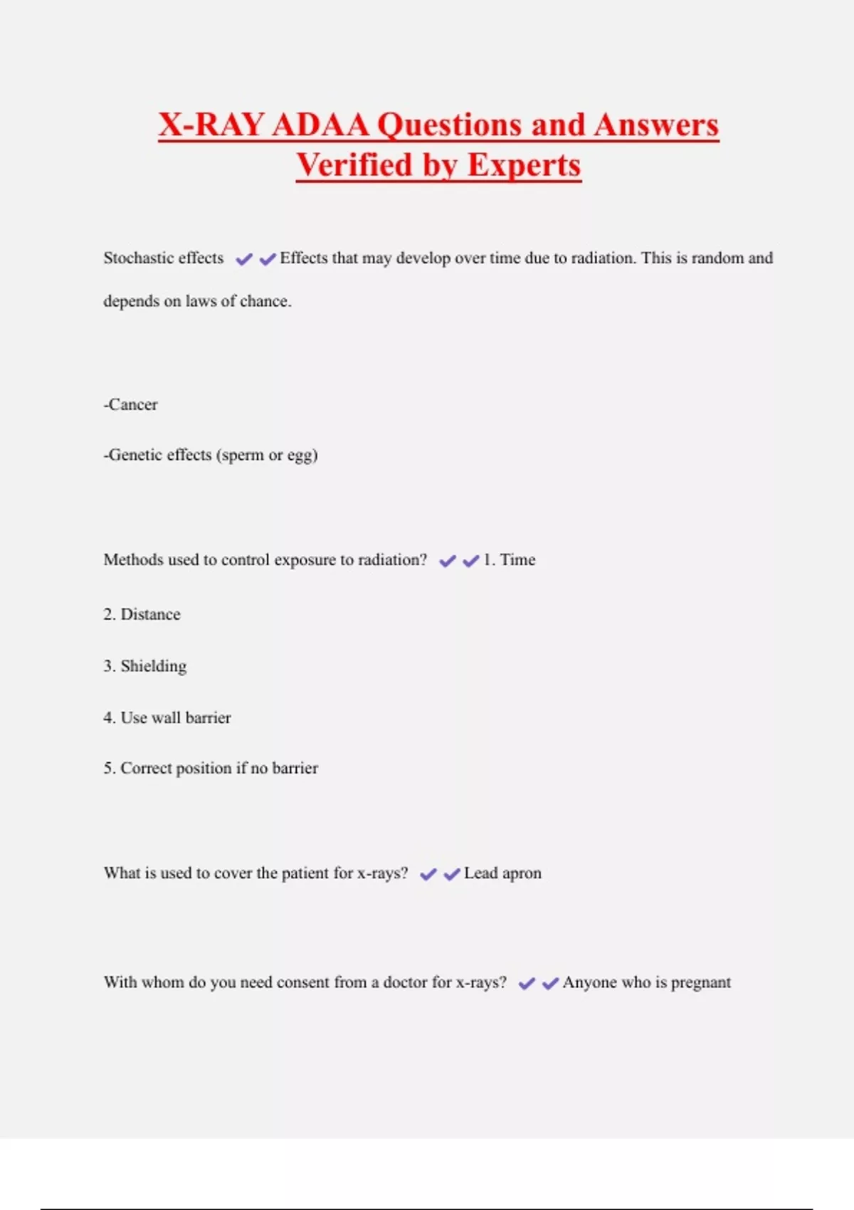 X-RAY ADAA Questions and Answers Verified by Experts Stochastic effects Effects that may develop over time due to radiation. This is random and depends on laws of chance. -Cancer -Genetic effects (sperm or egg) Methods used to control exposure to radiation? 1. Time 2. Distance 3. Shielding 4. Use wall barrier 5. Correct position if no barrier