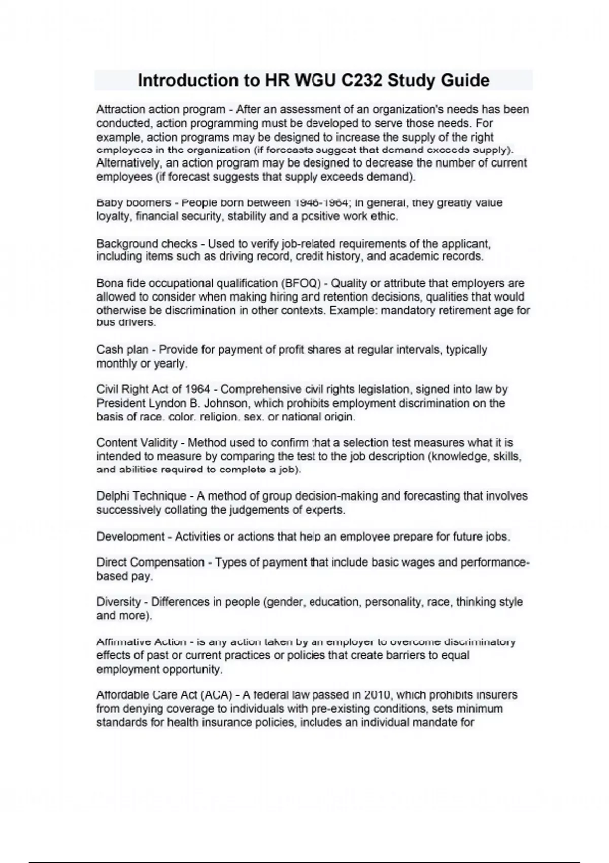 Attraction action program - After an assessment of an organization's needs has been conducted, action programming must be developed to serve those needs. For example, action programs may be designed to increase the supply of the right employees in the organization (if forecasts suggest that demand exceeds supply). Alternatively, an action program may be designed to decrease the number of current employees (if forecast suggests that supply exceeds demand). Baby boomers - People born between ; in general, they greatly value loyalty, financial security, stability and a positive work ethic. Background checks - Used to verify job-related requirements of the applicant, including items such as driving record, credit history, and academic records. Bona fide occupational qualification (BFOQ) - Quality or attribute that employers are allowed to consider when making hiring and retention decisions, qualities that would otherwise be discrimination in other contexts. Example: mandatory retirement age for bus drivers. Cash plan - Provide for payment of profit shares at regular intervals, typically monthly or yearly. Civil Right Act of 1964 - Comprehensive civil rights legislation, signed into law by President Lyndon B. Johnson, which prohibits employment discrimination on the basis of race, color, religion, sex, or national origin. Content Validity - Method used to confirm that a selection test measures what it is intended to measure by comparing the test to the job description (knowledge, skills, and abilities required to complete a job). Delphi Technique - A method of group decision-making and forecasting that involves successively collating the judgements of experts. Development - Activities or actions that help an employee prepare for future jobs. Direct Compensation - Types of payment that include basic wages and performancebased pay. Diversity - Differences in people (gender, education, personality, race, thinking style and more). Affirmative Action - is any action taken by an employer to overcome discriminatory effects of past or current practices or policies that create barriers to equal employment opportunity. Affordable Care Act (ACA) - A federal law passed in 2010, which prohibits insurers from denying coverage to individuals with pre-existing conditions, sets minimum standards for health insurance policies, includes an individual mandate for individuals to have a health insurance policy, and expands Medicaid eligibility for many individuals and families. Age Discrimination - The denial of rights or privileges or other unfair treatment of someone (an applicant or employee) because of age. Age Discrimination in Employment Act of 1967 (ADEA) - A federal law that protects workers age 40 and older from employment discrimination based on their age. Americans with Disabilities Act of 1990 (ADA) - A federal law that prohibits discrimination on the basis of disability. The ADA ensures equal opportunity for individuals with disabilities in all aspects of employment as well as in other public services. Business Ethics - The values and principles that are used to evaluate whether the collective behavior of an organization's members is appropriate. Civil Rights Act of 1991 - This Act allows for compensatory and punitive damages for violations of Title VII. Civil Rights Acts of 1866, 1870, and 1871 - These acts prohibit employers from discriminating against minorities. Correlation Coefficient - reflects the stability of a test over time—the higher the coefficient of stability, the more reliable the measure. Culture - represents an organization's value system. It includes factors such as employees' willingness to work, their ethics, how the organization thinks they should be treated, and so on. Define "Reliability" - The consistency or stability of a selection instrument Define "Validity" - How accurately and precisely a measure assesses an attribute; it assumes the appropriateness of using a given measuring device for drawing inferences about the criteria Demand - The number and types of employees you will need to achieve the organization's strategic mission Supply - The number and types of employees who will be available now or in the future to fill the jobs Defined Benefit Plan - A retirement plan in which the employer commits (and pays) a specific monthly benefit (or amount) to the employee when the employee retires. Defined Contribution Plan - A retirement plan in which the employer pays a specific amount, or contribution, to an employee's retirement during each pay period that the employee is with the firm. Both the traditional 401(k) and Roth 401(k) plans are examples of defined contribution plans. Deontological Theories - evaluate the rightness or wrongness of an action based on how well that action conforms to some rule or principle, regardless of the consequences. Developing Data - The first phase of the process of human resources planning. Includes inventories of the current workforce, projected future needs, and an understanding of what will be required to meet those needs. Disability - According to the Americans with Disabilities Act, a disability includes: a physical or mental impairment that substantially limits one or more major life activities; a record of such impairment; or being perceived as having such an impairment. Empirical Validity - (also called statistical or predictive validity) describes how closely scores on a test correspond (correlate) with behavior as measured in other contexts. Employee Benefits - The parts of the total compensation package (other than pay for time worked) provided to employees in whole or in part by employer payments such as life insurance, pension, worker's compensation, and vacation. Rewards are provided by the organization to employees for their membership and/or participation (attendance) in the organization. Employee Referral Programs - Word-of-mouth advertisements that generally involve rewarding employees for referring skilled job applicants to 