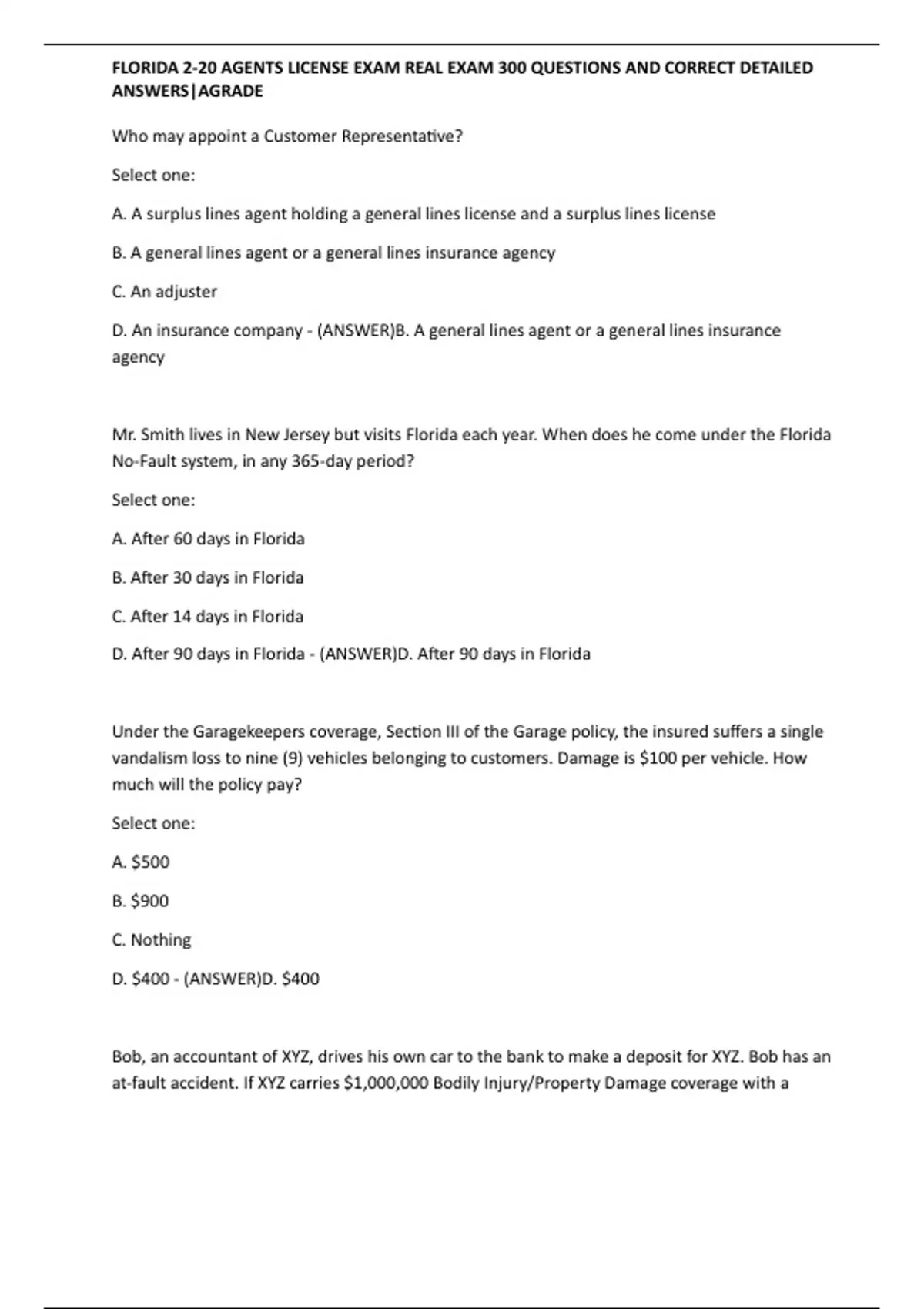 , FLORIDA 2-20 AGENTS LICENSE EXAM REAL EXAM 300 QUESTIONS AND CORRECT DETAILED