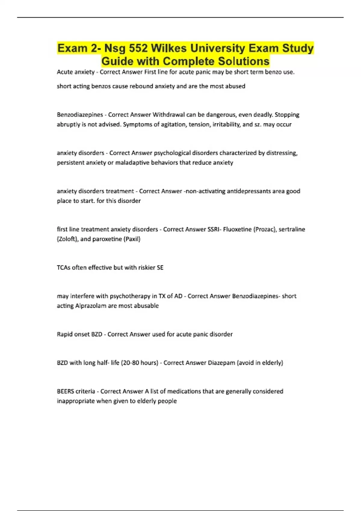 Exam 2- Nsg 552 Wilkes University Exam Study Guide with Complete Solutions Acute anxiety - Correct Answer First line for acute panic may be short term benzo use. short acting benzos cause rebound anxiety and are the most abused Benzodiazepines - Correct Answer Withdrawal can be dangerous, even deadly. Stopping abruptly is not advised. Symptoms of agitation, tension, irritability, and sz. may occur anxiety disorders - Correct Answer psychological disorders characterized by distressing, persistent anxiety or maladaptive behaviors that reduce anxiety anxiety disorders treatment - Correct Answer -non-activating antidepressants area good place to start. for this disorder first line treatment anxiety disorders - Correct Answer SSRI- Fluoxetine (Prozac), sertraline (Zoloft), and paroxetine (Paxil) TCAs often effective but with riskier SE may interfere with psychotherapy in TX of AD - Correct Answer Benzodiazepines- short acting Alprazolam are most abusable Rapid onset BZD - Correct Answer used for acute panic disorder BZD with long half- life (20-80 hours) - Correct Answer Diazepam (avoid in elderly) BEERS criteria - Correct Answer A list of medications that are generally considered inappropriate when given to elderly people BEERS criteria - Correct Answer Identifies High Risk Meds to Generate Wide List of Meds That Should be Avoided