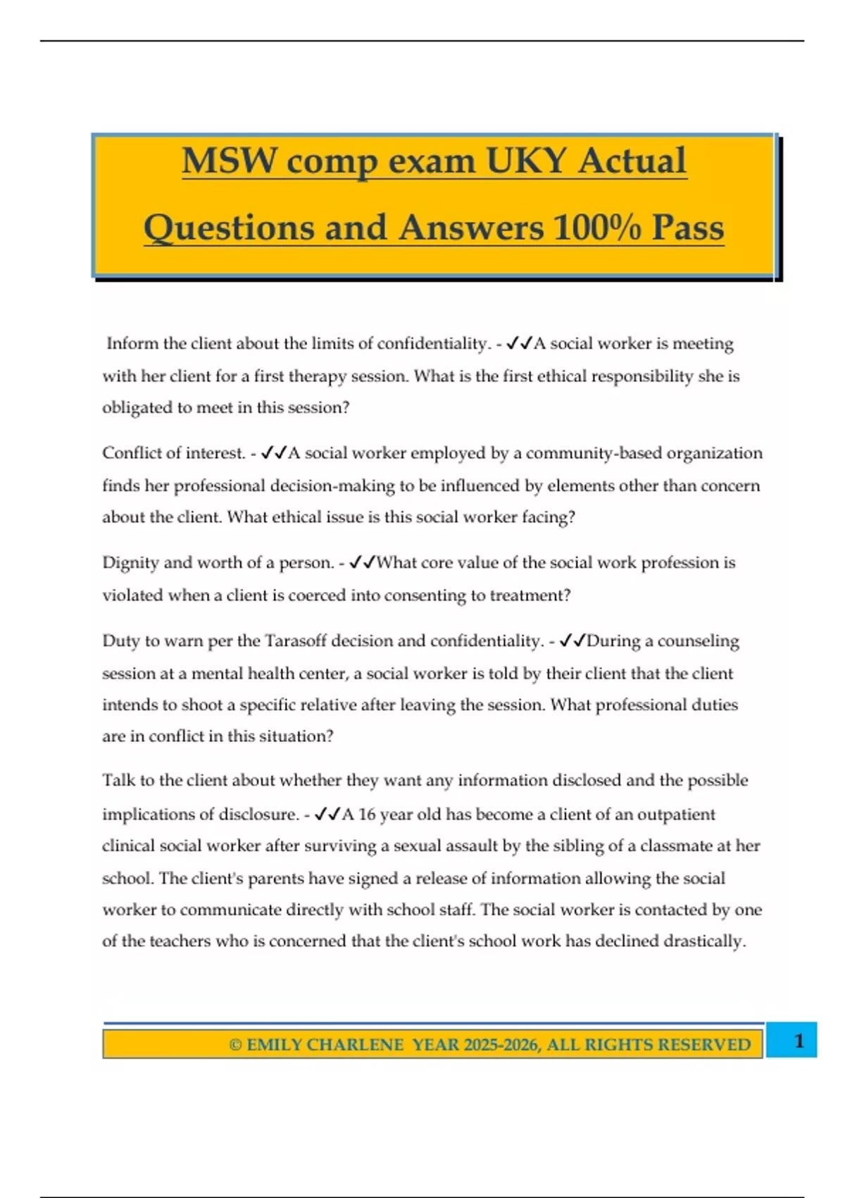 MSW comp exam UKY Actual Questions and Answers 100% Pass Inform the client about the limits of confidentiality. - A social worker is meeting with her client for a first therapy session. What is the first ethical responsibility she is obligated to meet in this session? Conflict of interest. - A social worker employed by a community-based organization finds her professional decision-making to be influenced by elements other than concern about the client. What ethical issue is this social worker facing? Dignity and worth of a person. - What core value of the social work profession is violated when a client is coerced into consenting to treatment? Duty to warn per the Tarasoff decision and confidentiality. - During a counseling session at a mental health center, a social worker is told by their client that the client intends to shoot a specific relative after leaving the session. What professional duties are in conflict in this situation? Talk to the client about whether they want any information disclosed and the possible implications of disclosure. - A 16 year old has become a client of an outpatient clinical social worker after surviving a sexual assault by the sibling of a classmate at her school. The client's parents have signed a release of information allowing the social worker to communicate directly with school staff. The social worker is contacted by one of the teachers who is concerned that the client's school work has declined drastically. 2© EMILY CHARLENE YEAR , ALL RIGHTS RESERVED The teacher wants to know if something has happened to the client. What should the social worker do in this situation? Assess the situation for risk of potential harm or exploitation of the client. - Adele, a social worker employed by a program serving at-risk youth at a local YMCA in an urban community, lives in an apartment complex within walking distance of her work. An avid reader, she frequently visits the local library and has joined a monthly reading group. At her most recent visit, the group welcomed a new member who happens to be the mother of one of the youths in her program. To determine how to respond to this situation, what should Adele do first? Report the situation to your supervisor. - During a counseling session, a client with a history of relationship problems shares a text she received from one of your co- workers inviting her to a social event as their date. Your co-worker is part of the treatment team that regularly reviews client cases (including your client) and evaluates their progress. The client is seeking your advice about whether to accept the date and attend the event. What should you do? The participant must be compensated either financially or by directly benefiting from the study. There is generally no guarantee that subjects will directly benefit from participation in research. In order to provide informed consent, before they agree to participate potential subjects should be informed of the potential risks and benefits and whether or not they will receive some compensation for their participation in a study. - According to the Nuremberg Code, which provides the basis for Institutional Review Boards' requirements for human subjects research, voluntary consent to participate in research activities is an imperative. Which of the following statements does not meet the criteria defining voluntary informed consent? 3© EMILY CHARLENE YEAR , ALL RIGHTS RESERVED Avoid generalizations. To provide culturally responsive evaluation and treatment planning, counselors and programs must understand and incorporate relevant cultural factors into the process while avoiding a stereotypical or "one-size-fits-all" approach to treatment. - In working with clients from a racial or ethnic group different from their own, what are social workers advised to do? "What is your sexual orientation?" Asked in a non-judgmental manner, this clearly asks for specific information without being as open-ended as "tell me about your sexuality" or as limiting and discriminatory as the other responses. - A social worker is conducting an initial assessment with a client. What is the best way for the social worker to inquire