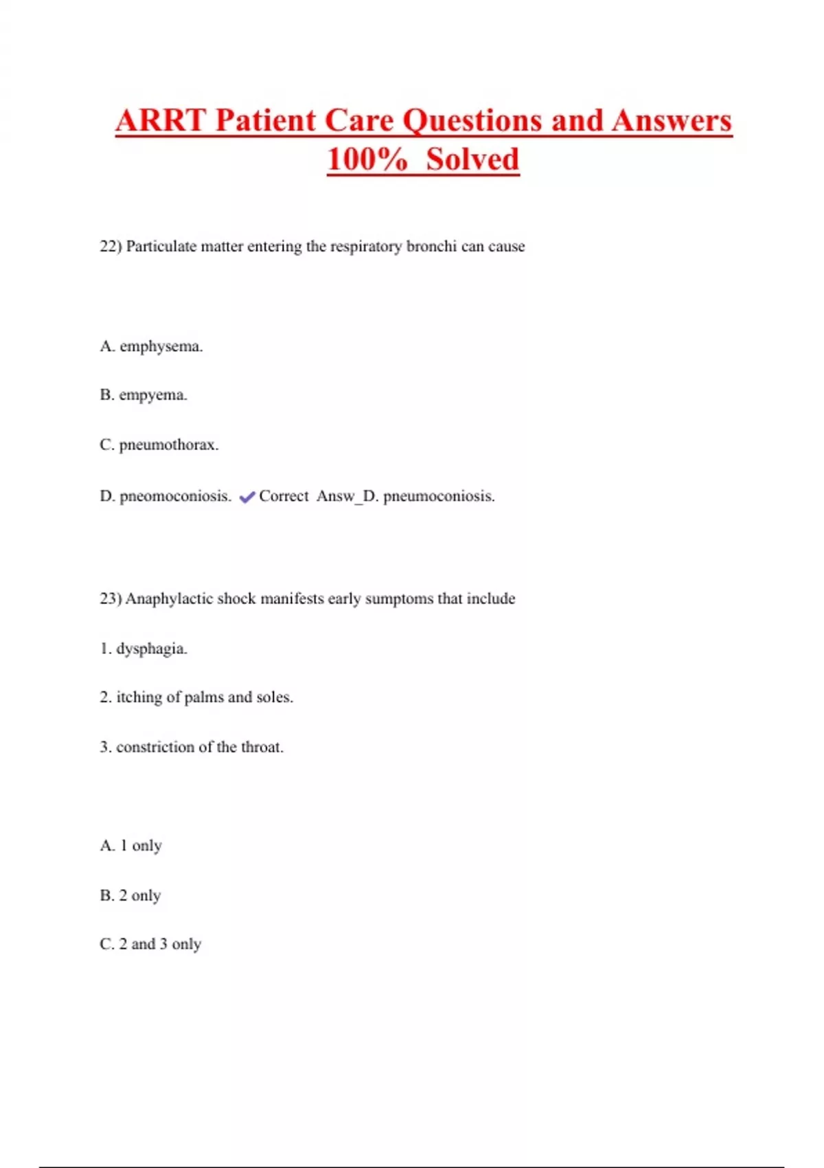 ARRT Patient Care Questions and Answers 100% Solved 22) Particulate matter entering the respiratory bronchi can cause A. emphysema. B. empyema. C. pneumothorax. D. pneomoconiosis. Correct Answ_D. pneumoconiosis. 23) Anaphylactic shock manifests early sumptoms that include 1. dysphagia. 2. itching of palms and soles. 3. constriction of the throat.