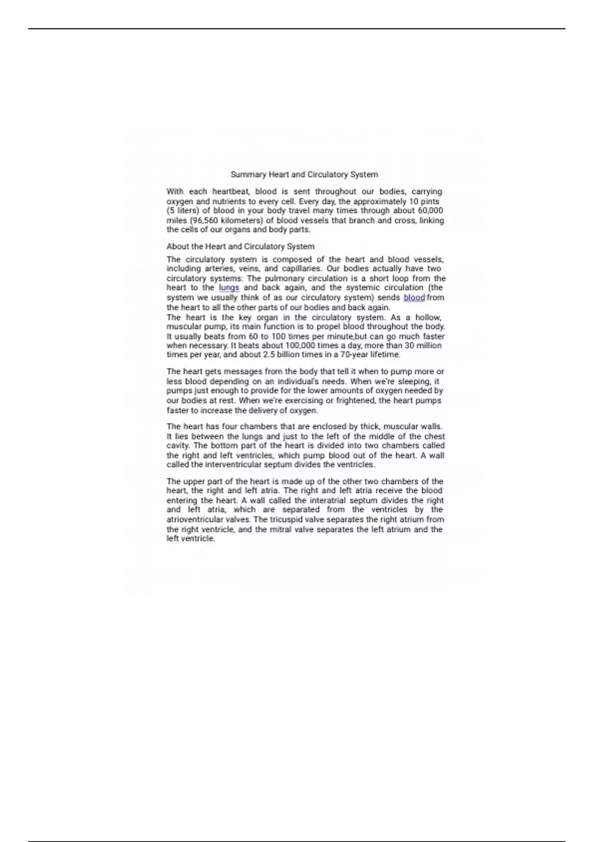 Summary Heart and Circulatory System