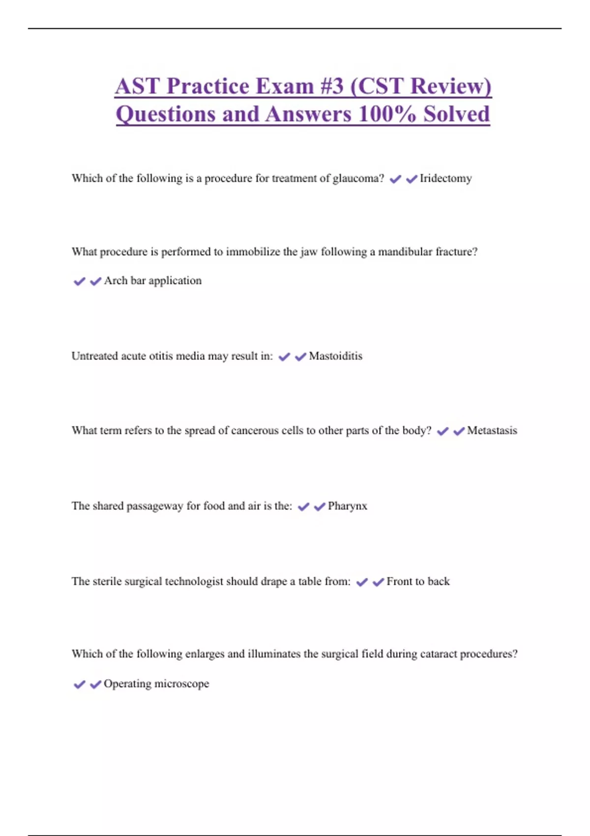 AST Practice Exam #3 (CST Review) Questions and Answers 100% Solved Which of the following is a procedure for treatment of glaucoma? Iridectomy What procedure is performed to immobilize the jaw following a mandibular fracture? Arch bar application Untreated acute otitis media may result in: Mastoiditis What term refers to the spread of cancerous cells to other parts of the body? Metastasis