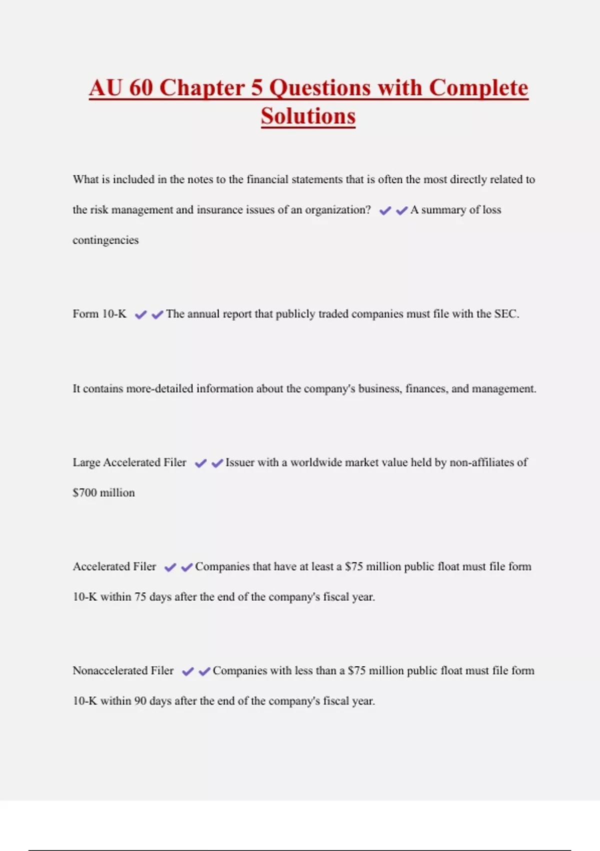 AU 60 Chapter 5 Questions with Complete Solutions What is included in the notes to the financial statements that is often the most directly related to the risk management and insurance issues of an organization? A summary of loss contingencies Form 10-K The annual report that publicly traded companies must file with the SEC. It contains more-detailed information about the company's business, finances, and management. Large Accelerated Filer Issuer with a worldwide market value held by non-affiliates of $700 million
