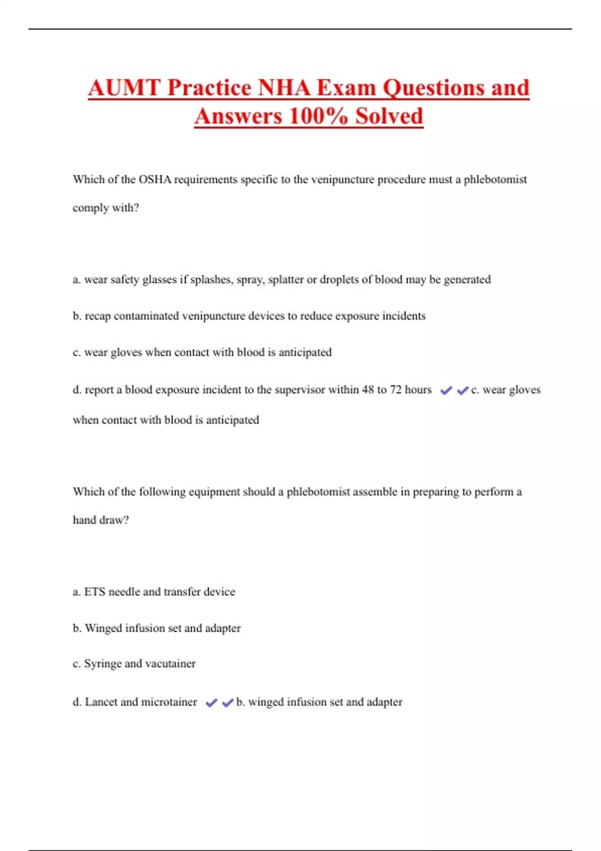 AUMT Practice NHA Exam Questions and Answers 100% Solved Which of the OSHA requirements specific to the venipuncture procedure must a phlebotomist comply with? a. wear safety glasses if splashes, spray, splatter or droplets of blood may be generated b. recap contaminated venipuncture devices to reduce exposure incidents c. wear gloves when contact with blood is anticipated d. report a blood exposure incident to the supervisor within 48 to 72 hours c. wear gloves when contact with blood is anticipated
