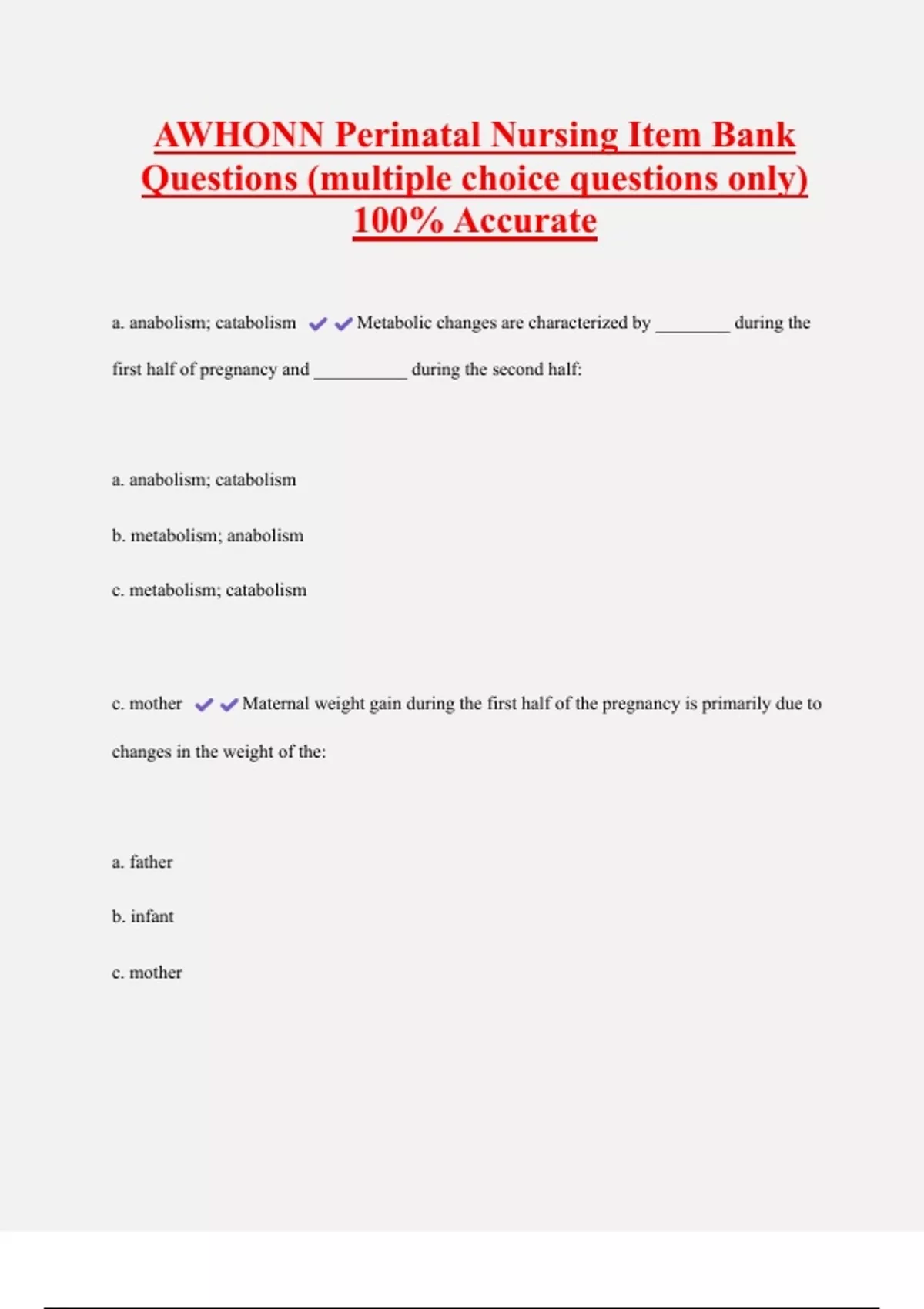 AWHONN Perinatal Nursing Item Bank Questions (multiple choice questions only) 100% Accurate a. anabolism; catabolism Metabolic changes are characterized by ________ during the first half of pregnancy and __________ during the second half: a. anabolism; catabolism b. metabolism; anabolism c. metabolism; catabolism