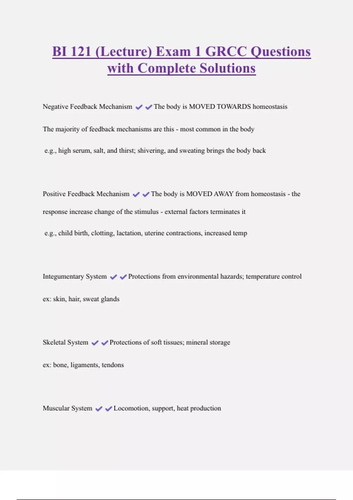 BI 121 (Lecture) Exam 1 GRCC Questions with Complete Solutions Negative Feedback Mechanism The body is MOVED TOWARDS homeostasis The majority of feedback mechanisms are this - most common in the body e.g., high serum, salt, and thirst; shivering, and sweating brings the body back Positive Feedback Mechanism The body is MOVED AWAY from homeostasis - the response increase change of the stimulus - external factors terminates it e.g., child birth, clotting, lactation, uterine contractions, increased temp