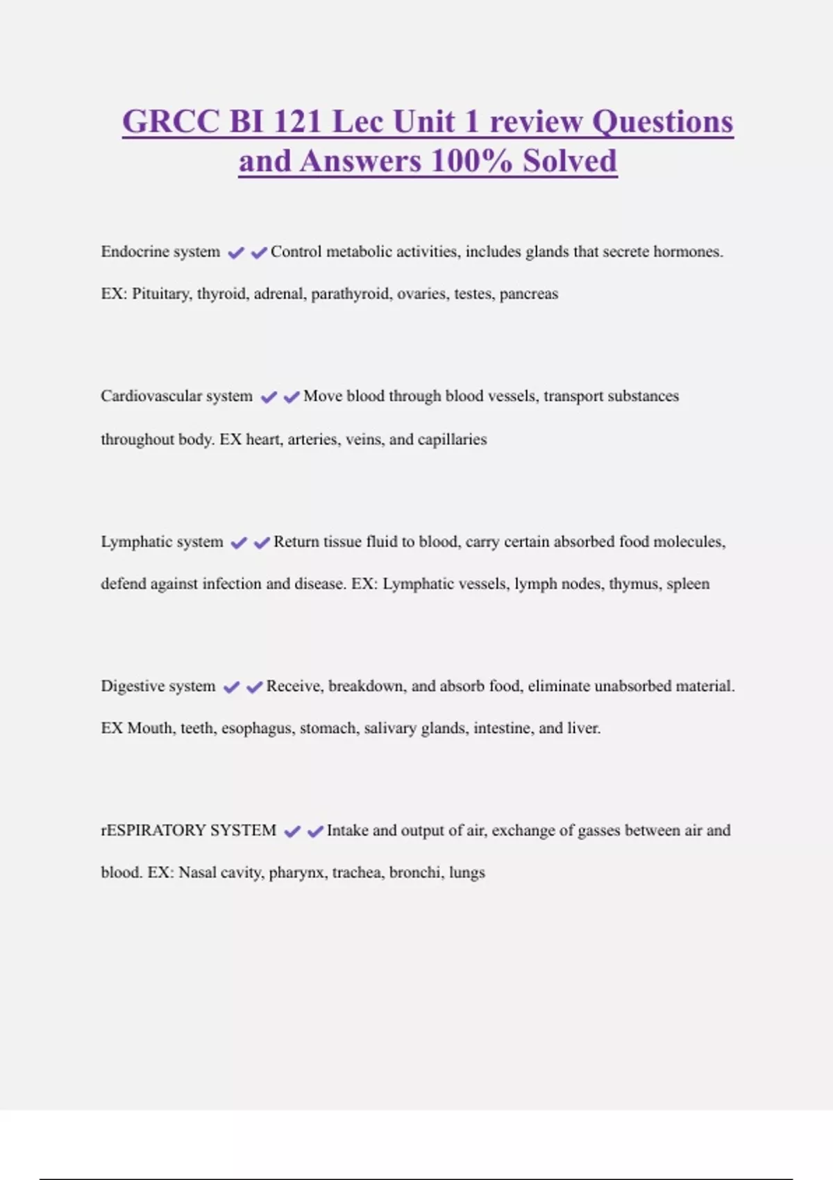 GRCC BI 121 Lec Unit 1 review Questions and Answers 100% Solved Endocrine system Control metabolic activities, includes glands that secrete hormones. EX: Pituitary, thyroid, adrenal, parathyroid, ovaries, testes, pancreas Cardiovascular system Move blood through blood vessels, transport substances throughout body. EX heart, arteries, veins, and capillaries Lymphatic system Return tissue fluid to blood, carry certain absorbed food molecules, defend against infection and disease. EX: Lymphatic vessels, lymph nodes, thymus, spleen