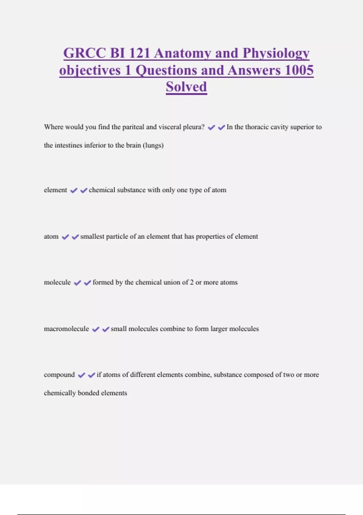 GRCC BI 121 Anatomy and Physiology objectives 1 Questions and Answers 1005 Solved Where would you find the pariteal and visceral pleura? In the thoracic cavity superior to the intestines inferior to the brain (lungs) element chemical substance with only one type of atom atom smallest particle of an element that has properties of element molecule formed by the chemical union of 2 or more atoms