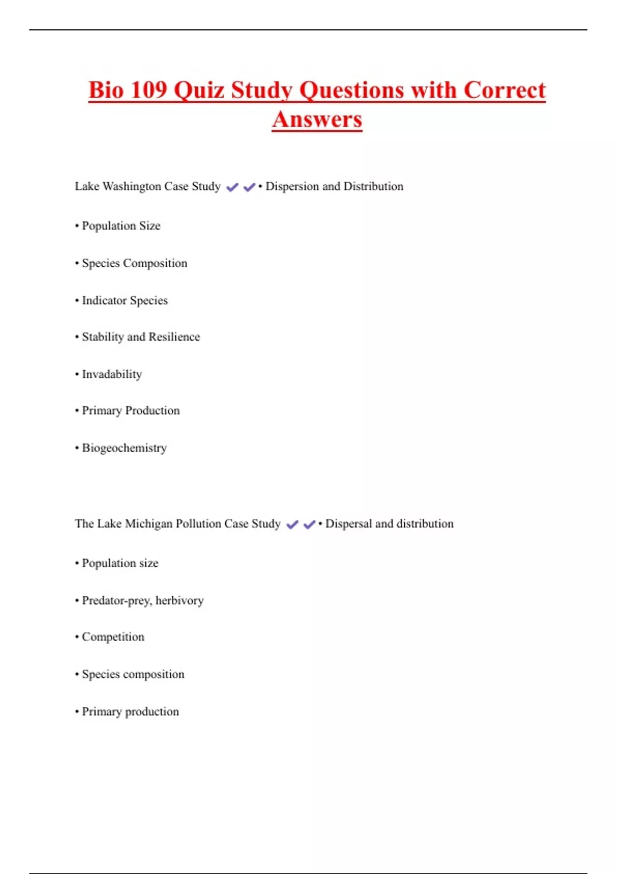Bio 109 Quiz Study Questions with Correct