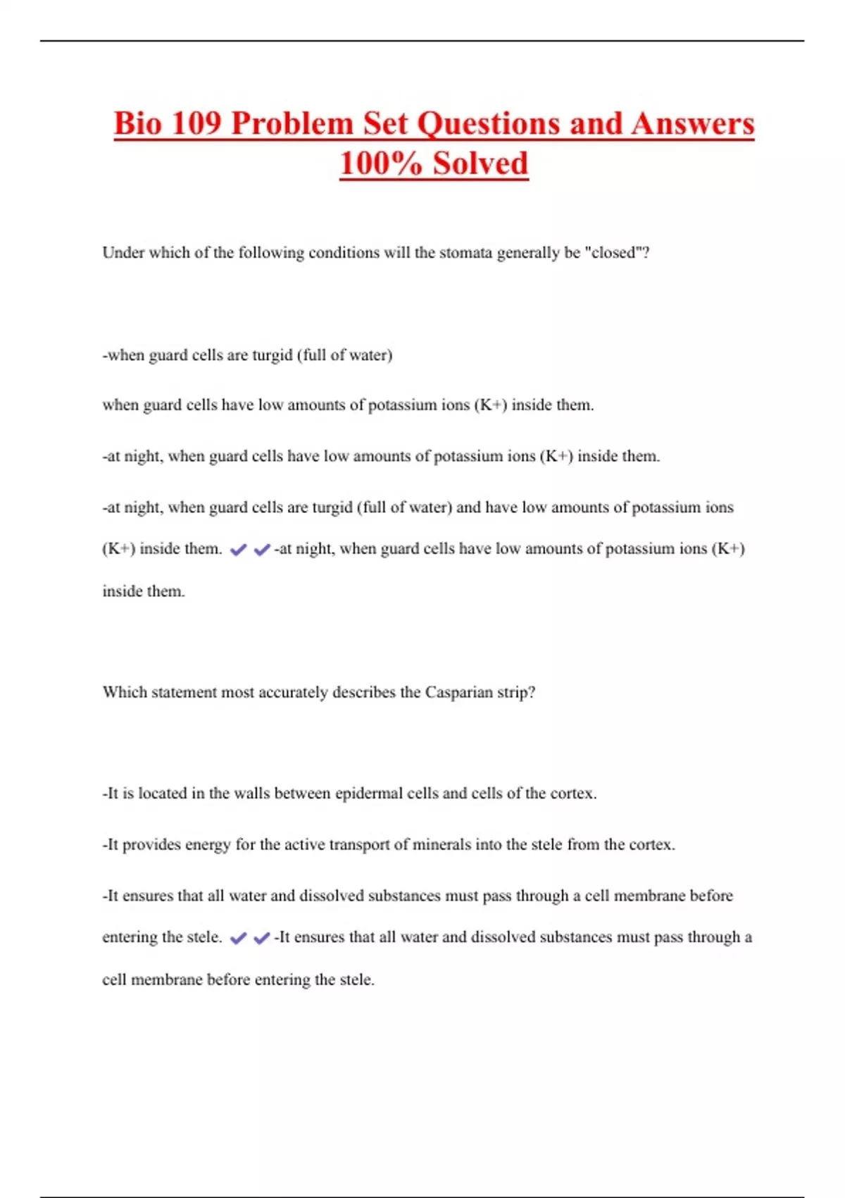 Bio 109 Problem Set Questions and Answers 100% Solved Under which of the following conditions will the stomata generally be "closed"? -when guard cells are turgid (full of water) when guard cells have low amounts of potassium ions (K+) inside them. -at night, when guard cells have low amounts of potassium ions (K+) inside them. -at night, when guard cells are turgid (full of water) and have low amounts of potassium ions (K+) inside them. -at night, when guard cells have low amounts of potassium ions (K+) inside them