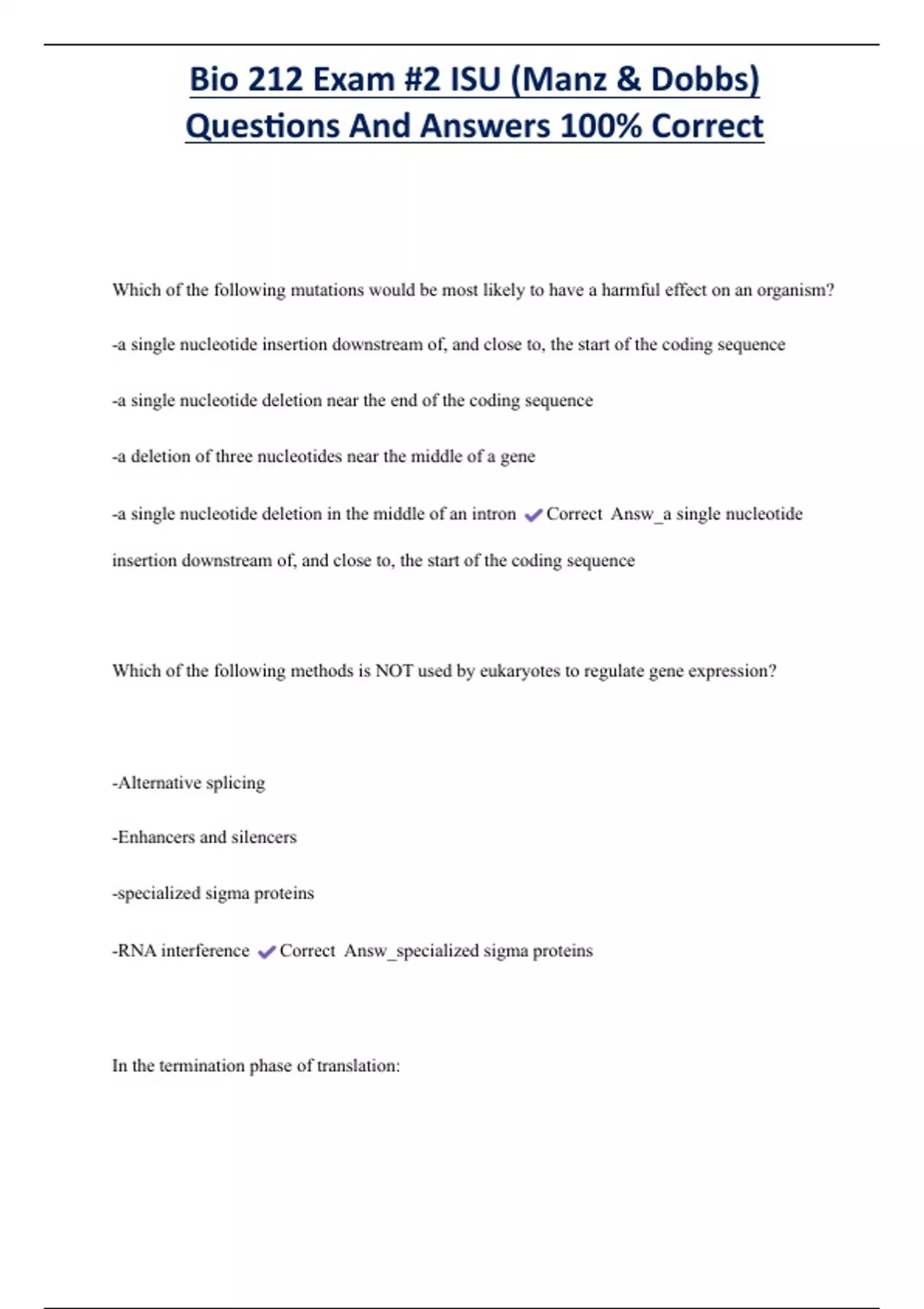 Bio 212 Exam #2 ISU (Manz & Dobbs) Questions And Answers 100% Correct Which of the following mutations would be most likely to have a harmful effect on an organism? -a single nucleotide insertion downstream of, and close to, the start of the coding sequence -a single nucleotide deletion near the end of the coding sequence -a deletion of three nucleotides near the middle of a gene -a single nucleotide deletion in the middle of an intron Correct Answ_a single nucleotide insertion downstream of, and close to, the start of the coding sequence
