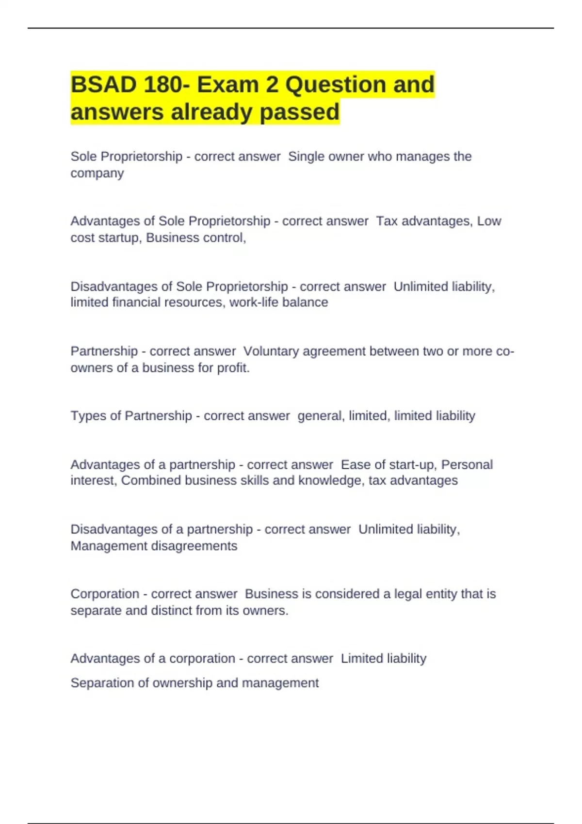 BSAD 180- Exam 2 Question and answers already passed Sole Proprietorship - correct answer Single owner who manages the company Advantages of Sole Proprietorship - correct answer Tax advantages, Low cost startup, Business control, Disadvantages of Sole Proprietorship - correct answer Unlimited liability, limited financial resources, work-life balance Partnership - correct answer Voluntary agreement between two or more co-owners of a business for profit. Types of Partnership - correct answer general, limited, limited liability Advantages of a partnership - correct answer Ease of start-up, Personal interest, Combined business skills and knowledge, tax advantages Disadvantages of a partnership - correct answer Unlimited liability, Management disagreements Corporation - correct answer Business is considered a legal entity that is separate and distinct from its owners.