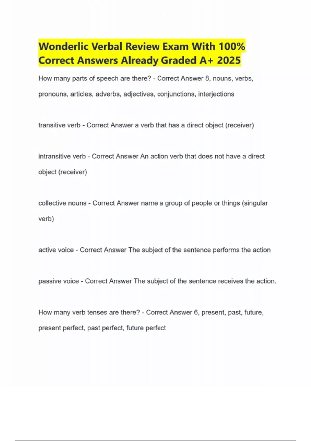 Wonderlic Verbal Review Exam With 100% Correct Answers Already Graded A+ 2025 How many parts of speech are there? - Correct Answer 8, nouns, verbs, pronouns, articles, adverbs, adjectives, conjunctions, interjections transitive verb - Correct Answer a verb that has a direct object (receiver) intransitive verb - Correct Answer An action verb that does not have a direct object (receiver) collective nouns - Correct Answer name a group of people or things (singular verb) active voice - Correct Answer The subject of the sentence performs the action passive voice - Correct Answer The subject of the sentence receives the action. How many verb tenses are there? - Correct Answer 6, present, past, future, present perfect, past perfect, future perfect How many sentence moods are there? - Correct Answer 3, indicative, imperative, subjunctive indicative mood - Correct Answer a verb form that states a fact, opinion or asks a question imperative mood - Correct Answer give commands subjunctive mood - Correct Answer A wish - A grammatical situation involving the words "if" and "were," setting up a hypothetical situation. How many degrees of comparison are there? - Correct Answer 3, positive, comparative, superlative