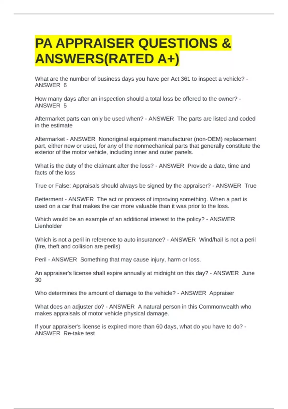 PA APPRAISER QUESTIONS & ANSWERS(RATED A+)