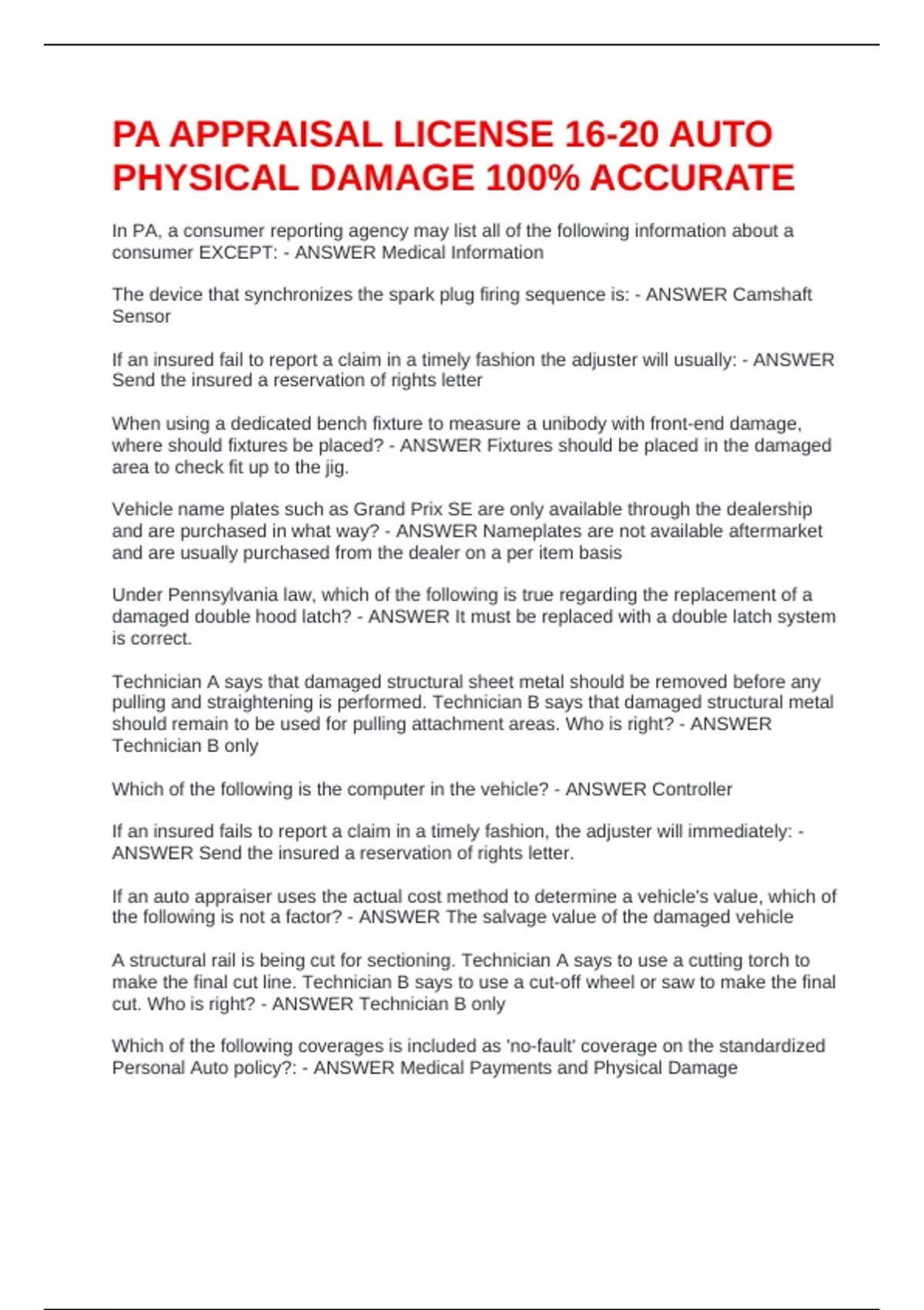 PA APPRAISAL LICENSE 16-20 AUTO PHYSICAL DAMAGE 100% ACCURATE