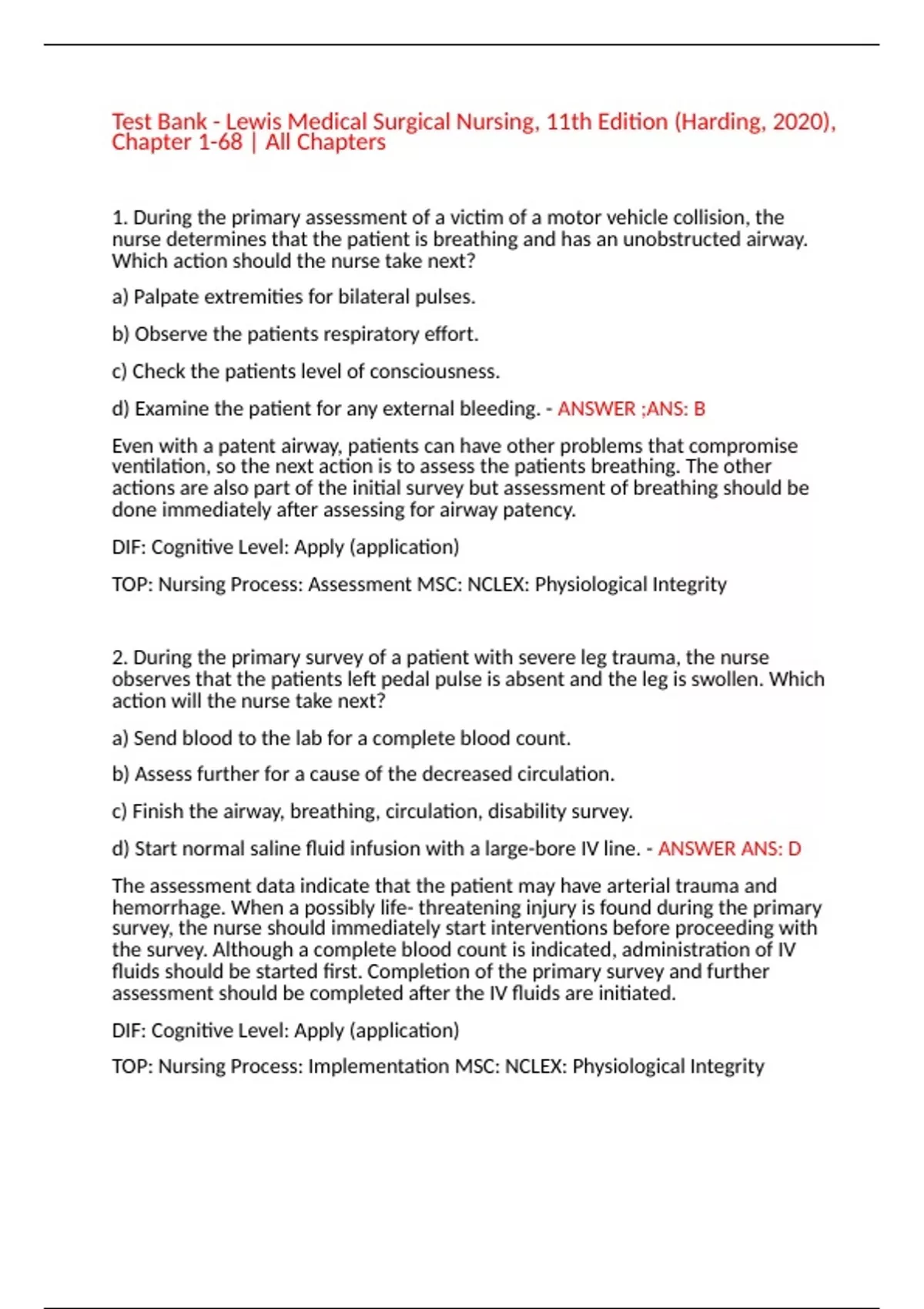 Test Bank - Lewis Medical Surgical Nursing, 11th Edition (Harding, 2020),