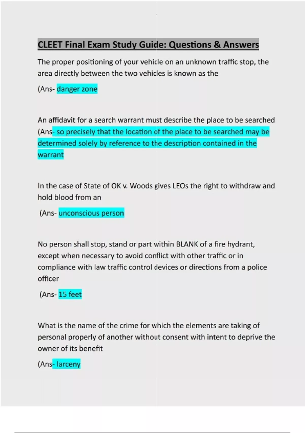 CLEET Final Exam Study Guide: Questions & Answers: Updated Solution