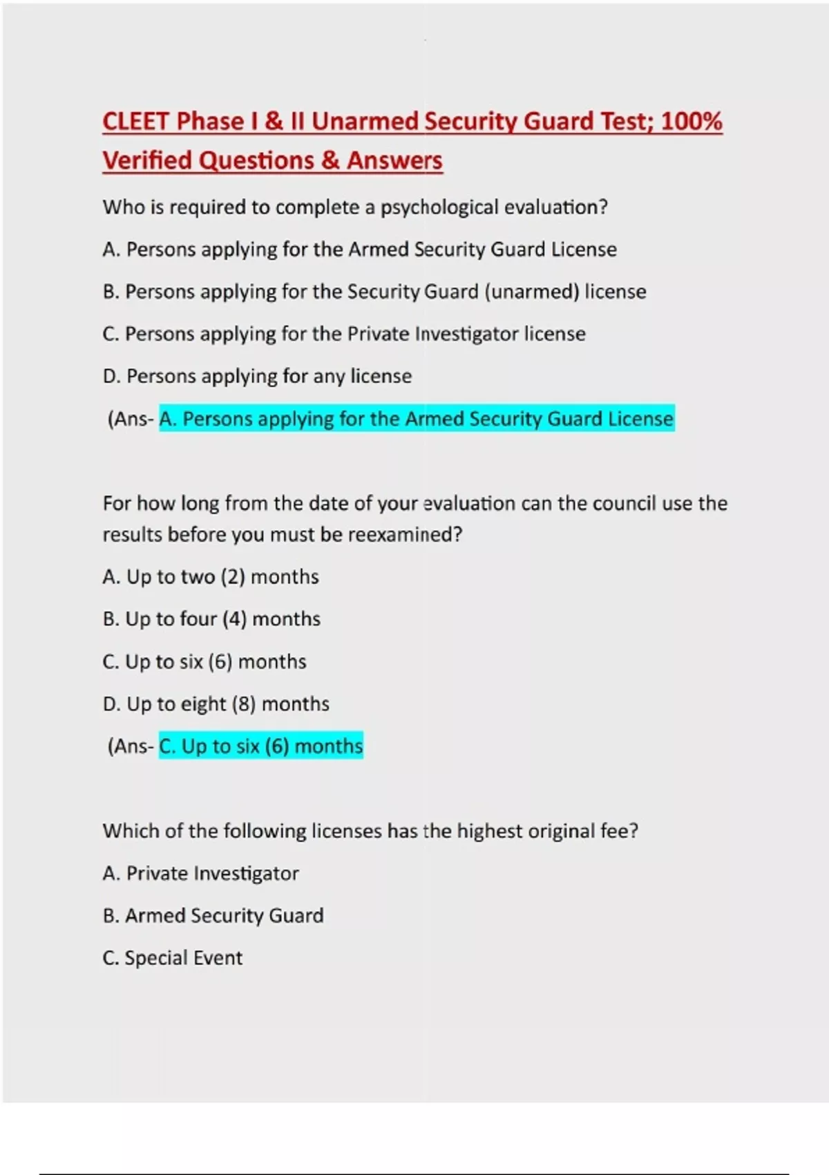 Who is required to complete a psychological evaluation? A. Persons applying for the Armed Security Guard License B. Persons applying for the Security Guard (unarmed) license C. Persons applying for the Private Investigator license D. Persons applying for any license (Ans- A. Persons applying for the Armed Security Guard License For how long from the date of your evaluation can the council use the results before you must be reexamined? A. Up to two (2) months B. Up to four (4) months C. Up to six (6) months D. Up to eight (8) months (Ans- C. Up to six (6) months Which of the following licenses has the highest original fee? A. Private Investigator B. Armed Security Guard C. Special EventD. Security Agency (Ans- D. Security Agency For how long is the Security Guard License valid? A. For a period of two (2) years and may be renewed for additional twoyear terms B. For a period of three (3) years, and may be renewed for additional three-year terms C. For a period of five (5) years, and may be renewed for additional fiveyear terms D. For any period of time not to exceed six (6) month (Ans- B. For a period of three (3) years, and may be renewed for additional three-year terms For how long is the Conditional License valid? A. For any period of time, not to exceed six (6 months) and may be renewed for additional six-month terms B. For the first six months of the regular license period, and may not be renewed C. For a period of one (1) year, any may be renewed for additional oneyear terms D. For a period of one (1) year, and may not be renewed (Ans- B. For the first six months of the regular license period, and may not be renew