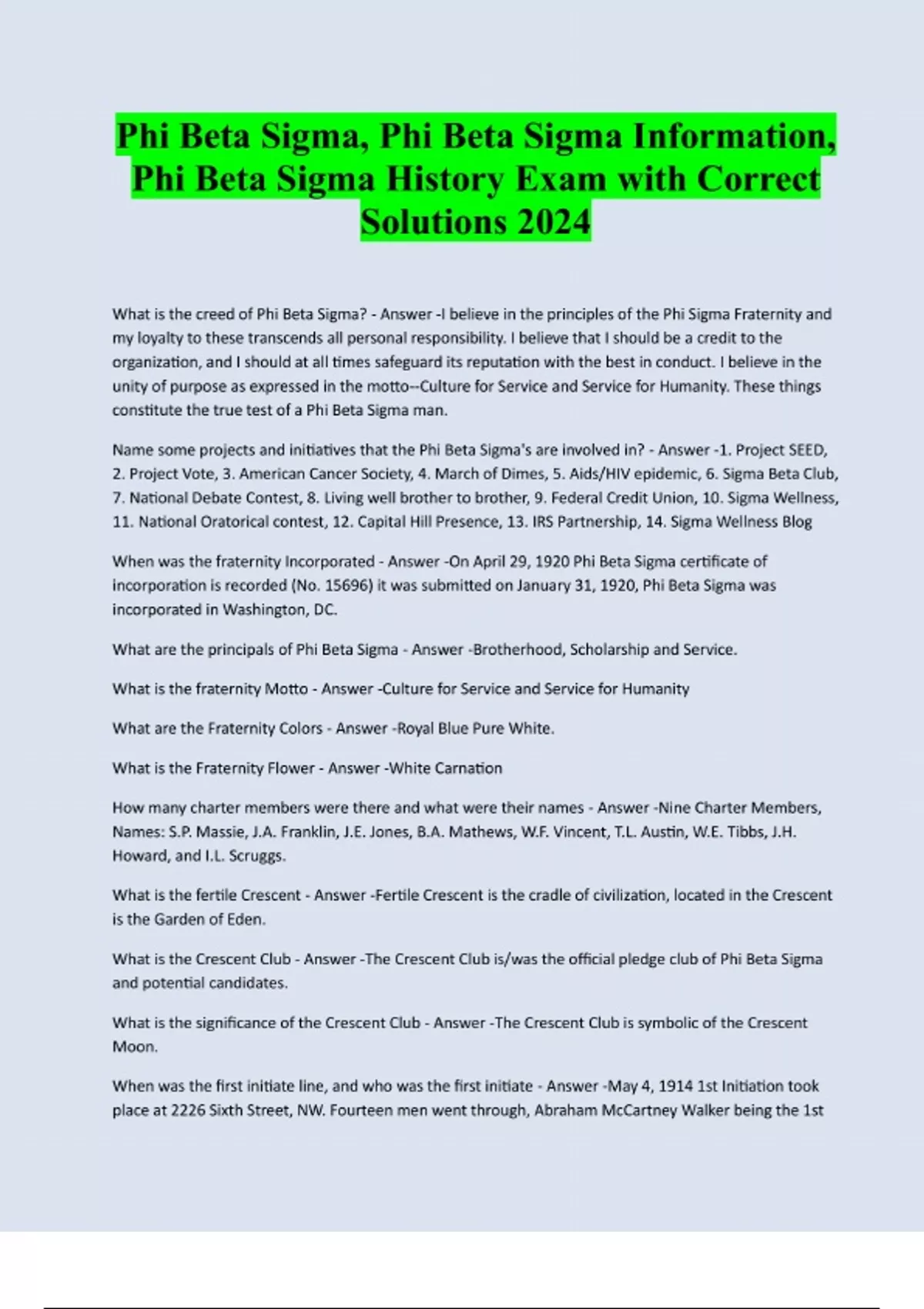 Phi Beta Sigma, Phi Beta Sigma Information, Phi Beta Sigma History Exam with Correct Solutions 2024 What is the creed of Phi Beta Sigma? - Answer -I believe in the principles of the Phi Sigma Fraternity and my loyalty to these transcends all personal responsibility. I believe that I should be a credit to the organization, and I should at all times safeguard its reputation with the best in conduct. I believe in the unity of purpose as expressed in the motto--Culture for Service and Service for Humanity. These things constitute the true test of a Phi Beta Sigma man. Name some projects and initiatives that the Phi Beta Sigma's are involved in? - Answer -1. Project SEED, 2. Project Vote, 3. American Cancer Society, 4. March of Dimes, 5. Aids/HIV epidemic, 6. Sigma Beta Club, 7. National Debate Contest, 8. Living well brother to brother, 9. Federal Credit Union, 10. Sigma Wellness, 11. National Oratorical contest, 12. Capital Hill Presence, 13. IRS Partnership, 14. Sigma Wellness Blog When was the fraternity Incorporated - Answer -On April 29, 1920 Phi Beta Sigma certificate of incorporation is recorded (No. 15696) it was submitted on January 31, 1920, Phi Beta Sigma was incorporated in Washington, DC. What are the principals of Phi Beta Sigma - Answer -Brotherhood, Scholarship and Service. What is the fraternity Motto - Answer -Culture for Service and Service for Humanity What are the Fraternity Colors - Answer -Royal Blue Pure White. What is the Fraternity Flower - Answer -White Carnation How many charter members were there and what were their names - Answer -Nine Charter Members, Names: S.P. Massie, J.A. Franklin, J.E. Jones, B.A. Mathews, W.F. Vincent, T.L. Austin, W.E. Tibbs, J.H. Howard, and I.L. Scruggs. What is the fertile Crescent - Answer -Fertile Crescent is the cradle of civilization, located in the Crescent is the Garden of Eden. What is the Crescent Club - Answer -The Crescent Club is/was the official pledge club of Phi Beta Sigma and potential candidates. What is the significance of the Crescent Club - Answer -The Crescent Club is symbolic of the Crescent Moon. When was the first initiate line, and who was the first initiate - Answer -May 4, 1914 1st Initiation took place at 2226 Sixth Street, NW. Fourteen men went through, Abraham McCartney Walker being the 1stto cross The Burning Sands he said "I believe in all that Phi Beta Sigma Fraternity represents, and I will herald and defend it, even against the world." The Founders of the Fraternity - Answer -The Most Honorable Abram Langston Taylor - Memphis TN, 1890, Leonard Francis Morse - New Bedford, MA 1889, Charles Ignatius Brown - Topeka,