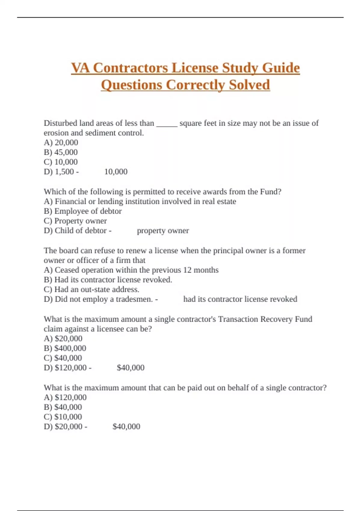 Disturbed land areas of less than _____ square feet in size may not be an issue of erosion and sediment control. A) 20,000 B) 45,000 C) 10,000 D) 1,500 - 10,000 Which of the following is permitted to receive awards from the Fund? A) Financial or lending institution involved in real estate B) Employee of debtor C) Property owner D) Child of debtor - property owner The board can refuse to renew a license when the principal owner is a former owner or officer of a firm that A) Ceased operation within the previous 12 months B) Had its contractor license revoked. C) Had an out-state address. D) Did not employ a tradesmen. - had its contractor license revoked What is the maximum amount a single contractor's Transaction Recovery Fund claim against a licensee can be? A) $20,000 B) $400,000 C) $40,000 D) $120,000 - $40,000 What is the maximum amount that can be paid out on behalf of a single contractor? A) $120,000 B) $40,000 C) $10,000 D) $20,000 - $40,000 A license was issued on 10/15/2003. The expiration date is _________. A) 10/15/2005 B) 10/31/2004 C) 10/31/2005 D) 11/01/2004 - 10/31/2005 A contractor does not notify a change of address and so does not receive a timely Notice of Renewal. Who is responsible when the contractor does not renew his license on time? A) USBC B) OSHA C) The licensee Contractor D) DPOR - The licensee Contractor A designated employee should be? A) Any full time worker B) At least 18 years old, full time employee, has passed required examination C) At least 18 years old and 5 years experienced for Class A D) The owner - at least 18 years old, full time employee, has passed required examination