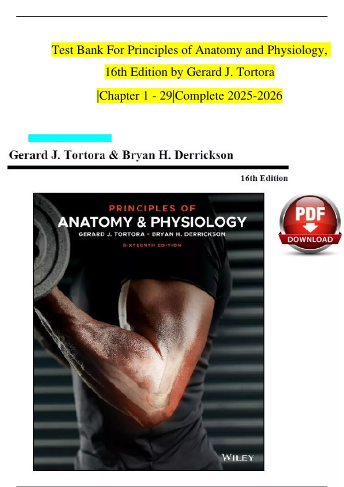 Test Bank For Principles of Anatomy and Physiology, 16th Edition by Gerard J. Tortora |Chapter 1 - 29|Complete