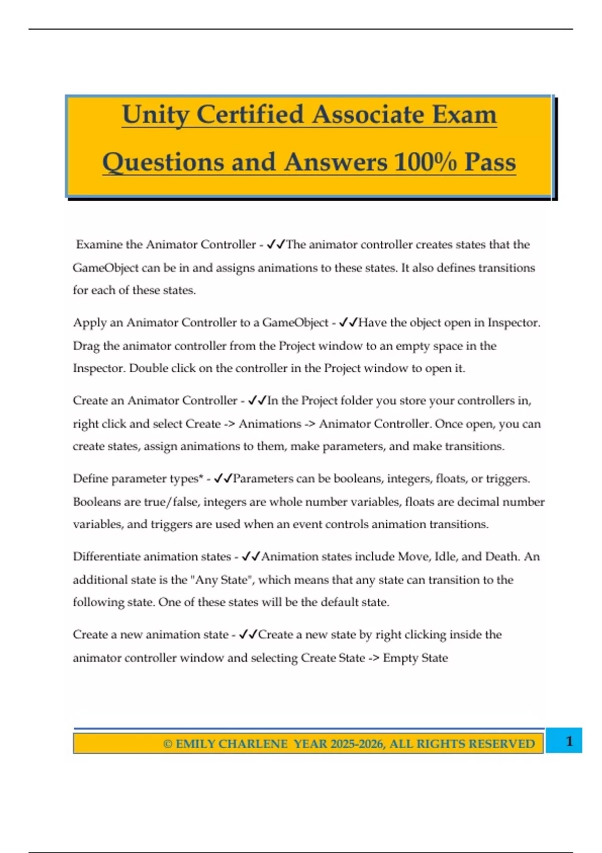 Unity Certified Associate Exam Questions and Answers 100% Pass Examine the Animator Controller - The animator controller creates states that the GameObject can be in and assigns animations to these states. It also defines transitions for each of these states. Apply an Animator Controller to a GameObject - Have the object open in Inspector. Drag the animator controller from the Project window to an empty space in the Inspector. Double click on the controller in the Project window to open it. Create an Animator Controller - In the Project folder you store your controllers in, right click and select Create -> Animations -> Animator Controller. Once open, you can create states, assign animations to them, make parameters, and make transitions. Define parameter types* - Parameters can be booleans, integers, floats, or triggers. Booleans are true/false, integers are whole number variables, floats are decimal number variables, and triggers are used when an event controls animation transitions. Differentiate animation states - Animation states include Move, Idle, and Death. An additional state is the "Any State", which means that any state can transition to the following state. One of these states will be the default state. Create a new animation state - Create a new state by right clicking inside the animator controller window and selecting Create State -> Empty State 2© EMILY CHARLENE YEAR , ALL RIGHTS RESERVED Implement the Any State - The Any State shows that any state can transition to the linked state. Automatically already in the Animator Controller. Explain transition conditions* - Transition conditions are parameters that state that a variable must be a certain amount before the transition can take place. To implement a transition condition, deselect "Has Exit Time" on the transition, make a parameter, and attach it to the transition in the Conditions section. Differentiate transition properties* - Transitions can move to the next state after a certain time ("Has Exit Time") or move only when a parameter is true. Transition properties only exist on transitions linking states that have animations already on them. Create transitions - Create a transition by right clicking on the first state, selecting Make Transition, and clicking on the second state. List compression formats* - Images can be compressed either losslessy or lossy. When you import an image asset, it shows import setting in the inspector. You can change the compression to none, low quality, normal quality, or high quality. You can also lower the import size of the image. Lossless formats are BMP, TGA, PNG, and TIFF. Lossly formats are JPEG. Differentiate GameObjects by their appearance - GameObjects can be 3D or 2D. 3D objects include cubes, spheres, capsules, planes, and cylinders. 2D objects include sprites and tilemaps. Identify GameObjects within a scene - GameObjects are physical models inside the scene. They highlight orange and have a move arrow on them when selected. Lights, cameras, UI, and particle system effects are also GameObject