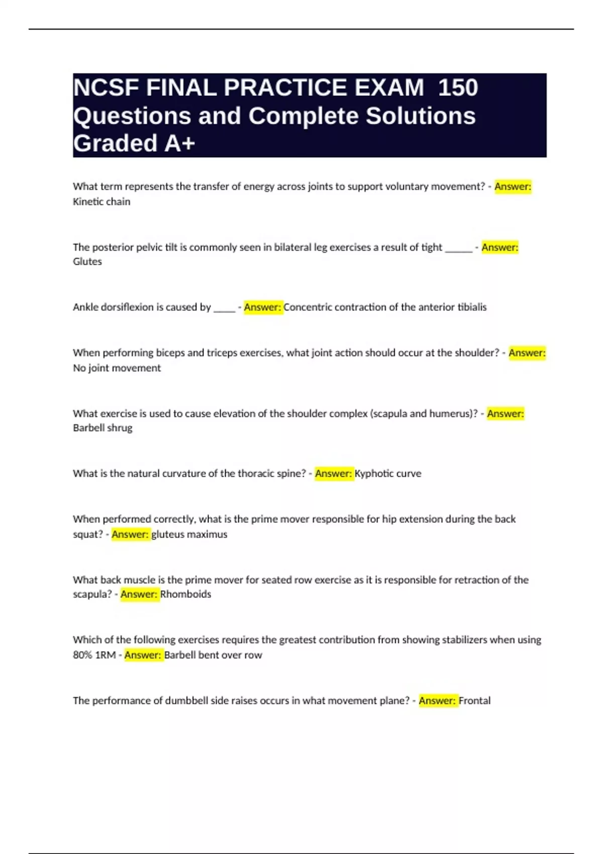 NCSF FINAL PRACTICE EXAM 150 Questions and Complete Solutions Graded A+ What term represents the transfer of energy across joints to support voluntary movement? - Answer: Kinetic chain The posterior pelvic tilt is commonly seen in bilateral leg exercises a result of tight _____ - Answer: Glutes Ankle dorsiflexion is caused by ____ - Answer: Concentric contraction of the anterior tibialis When performing biceps and triceps exercises, what joint action should occur at the shoulder? - Answer: No joint movement What exercise is used to cause elevation of the shoulder complex (scapula and humerus)? - Answer: Barbell shrug What is the natural curvature of the thoracic spine? - Answer: Kyphotic curve When performed correctly, what is the prime mover responsible for hip extension during the back squat? - Answer: gluteus maximus What back muscle is the prime mover for seated row exercise as it is responsible for retraction of the scapula? - Answer: Rhomboids Which of the following exercises requires the greatest contribution from showing stabilizers when using 80% 1RM - Answer: Barbell bent over row The performance of dumbbell side raises occurs in what movement plane? - Answer: Frontal What position of the knee is necessary to fully stretch the gastrocnemius when the ankle is in full dorsiflexion? - Answer: Fully extended What muscles are used to globally stabilize the humerus during the bench press? - Answer: Latissimus dorsi and deltoid Based on the principles of stability what exercise would be most difficult to stabilize? - Answer: Standing single arm dumbbell press To correct error in a lunge the client should be instructed to ____ - Answer: Take a broader step and push the back leg downward Which of the following refers to the cumulative input to the nervous system that relays body and position of movement? - Answer: Proprioception What muscle is the prime mover for lateral lunge performed in the picture? - Answer: Hip abductors Client should be instructed to retract the scapula dreamed of seated row exercise in order to effectively train the: - Answer: Rhomboids Aerobic metabolism in the muscle cell occurs within which organelle? - Answer: Mitochondria What anabolic hormone is released in higher concentrations in response to heavy resistance training? - Answer: Testosterone Which pair of movements employ reciprocal inhibition in a training session aimed at improving strength and flexibility? - Answer: Seated leg extension and hamstring stretch Which of the following is the only energy substrate that can be metabolized aerobically or anaerobically to produce ATP? - Answer: Glycogen What type of contraction is performed by the abdominals and erector spinae muscle group during the performance of a push-up? - Answer: Isometric What physiological response occurs when lactic buildup in the blood? - Answer: Respiration rates increase What has the greatest impact on relative hormonal response during exercise? - Answer: Intensity of exercise What causes the protein sparing mechanism to shut off during exercise? - Answer: Inadequate carbohydrates Besides body differences in muscle mass and strength capabilities why do females have lower cardiac output's compared to males? - Answer: Smaller relative heart side To optimize aerobic capacity to body increases oxygen delivery and extraction by adding: - Answer: Capillaries Why is it recommended to perform static stretches following exercise, and not before? - Answer: It is optimal as the body is warm, preexercise static stretching can reduce power output, it can help with the cool down and return to a homeostasic state Which system of the body has the greatest adoption rate when exposed to a new training stimulus? - Answer: Nervous system Delayed onset muscle soreness generally appears: - Answer: 24 to 48 hours after a training session ends Stroke volume levels off at about 40% VO to Max forcing the body to rely strictly on increased _____ to manage cardiac output as the intensity rises. - Answer: Heart rate Which of the following is a postural muscle characterized by a relatively greater slow twitch fibers density? - Answer: Soleus Which of the following recommendations would directly reduce the risk for heart disease? - Answer: Reducing chronic psychological stress Advancing age and disease reduce vessel responsiveness called _____ which increases risk for cardiovascular disease and stroke. - Answer: Vascular compliance Which type of exercise is most associated with measures of health and life expectancy? - Answer: Aerobic What effect does routine, moderate intensity aerobic training have on one's blood lipid profile? - Answer: HDL will increase Increased midsection girth with age is a concern because: - Answer: Android obesity is linked with heart disease What adaptation to aerobic exercise reduces heart rates at rest during submaximal exercise? - Answer: Increased stroke volume What negative affect does trans fat have on blood lipid profiles? - Answer: Reduced HDL What is the most unhealthy behavior as measured by risk for heart disease? - Answer: Smoking cigarettes What positive change can be expected from anaerobic exercise intervention for a hypertensive client lasting several months? - Answer: A reduction of blood pressure by 10 points What effect does chronic high blood insulin (hyperinsulinemia) have on body composition? - Answer: Increased body fat What becomes the most limited trunk movement for older adults due to aging process? - Answer: Extension How is sarcopenia prevented with advancing age? - Answer: Strength/power training What effect does vascular peripheral resistance have on physical health? - Answer: Increased blood pressure What type of performance training is most associated with independence for older adults? - Answer: Power Turbulent blood flow associated with hypertension often leads to _____ from vascular damage. - Answer: Coronary artery disease Which of the following identifies the correct body fat classification for morbi