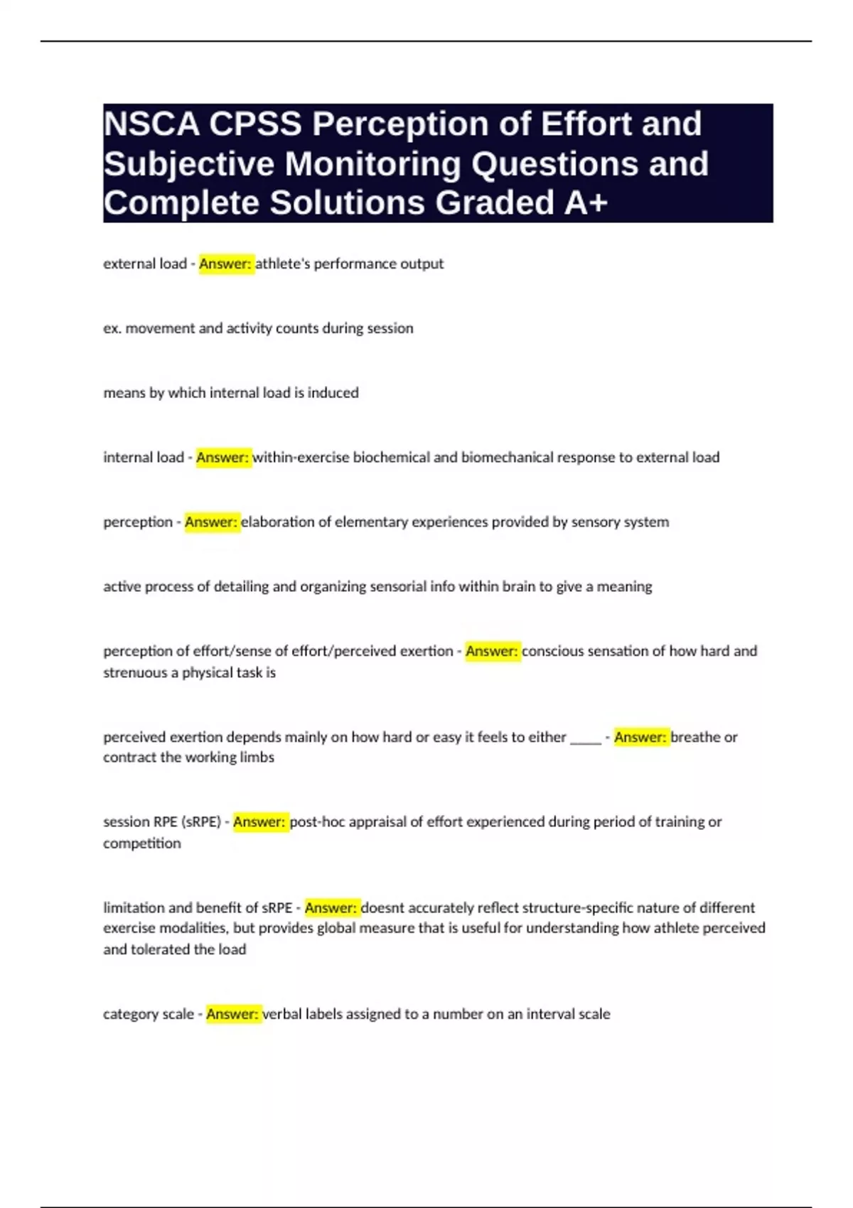 NSCA CPSS Perception of Effort and Subjective Monitoring Questions and Complete Solutions Graded A+