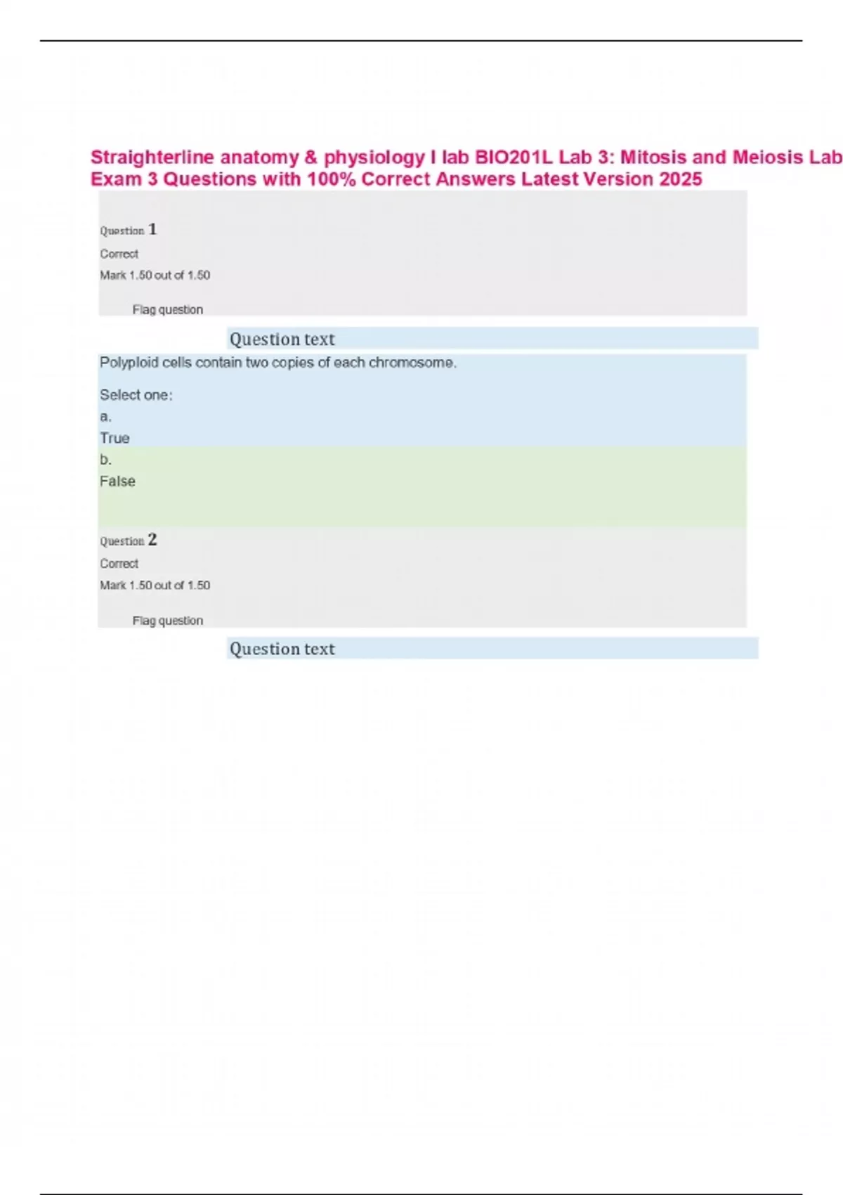 Straighterline anatomy & physiology I lab BIO201L Lab 3: Mitosis and Meiosis Lab Exam 3 Questions with 100% Correct Answers Latest Version 2025
