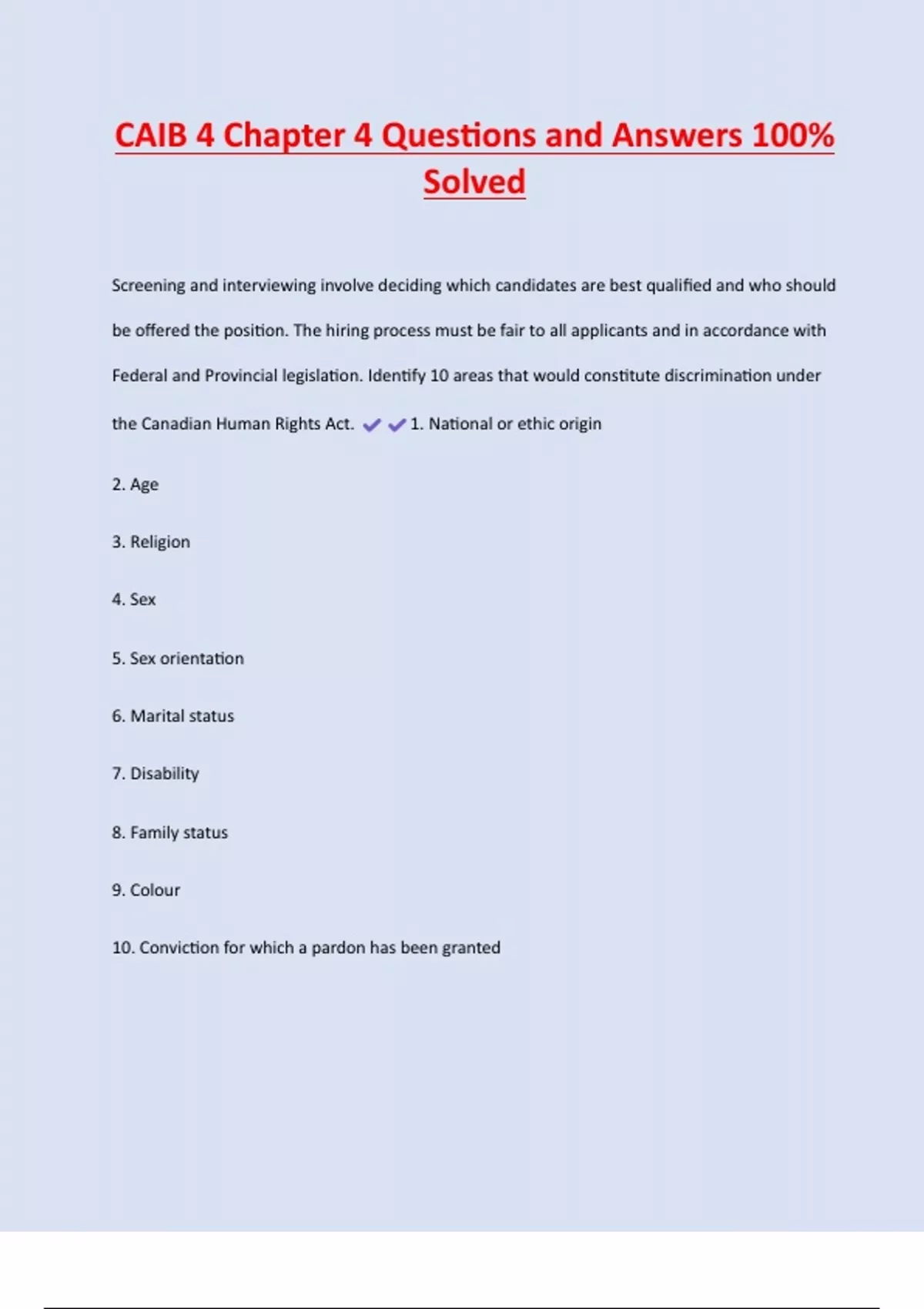 CAIB 4 Chapter 4 Questions and Answers 100% Solved Screening and interviewing involve deciding which candidates are best qualified and who should be offered the position. The hiring process must be fair to all applicants and in accordance with Federal and Provincial legislation. Identify 10 areas that would constitute discrimination under the Canadian Human Rights Act. 1. National or ethic origin 2. Age 3. Religion 4. Sex 5. Sex orientation 6. Marital status 7. Disability 8. Family status 9. Colour 10. Conviction for which a pardon has been granted