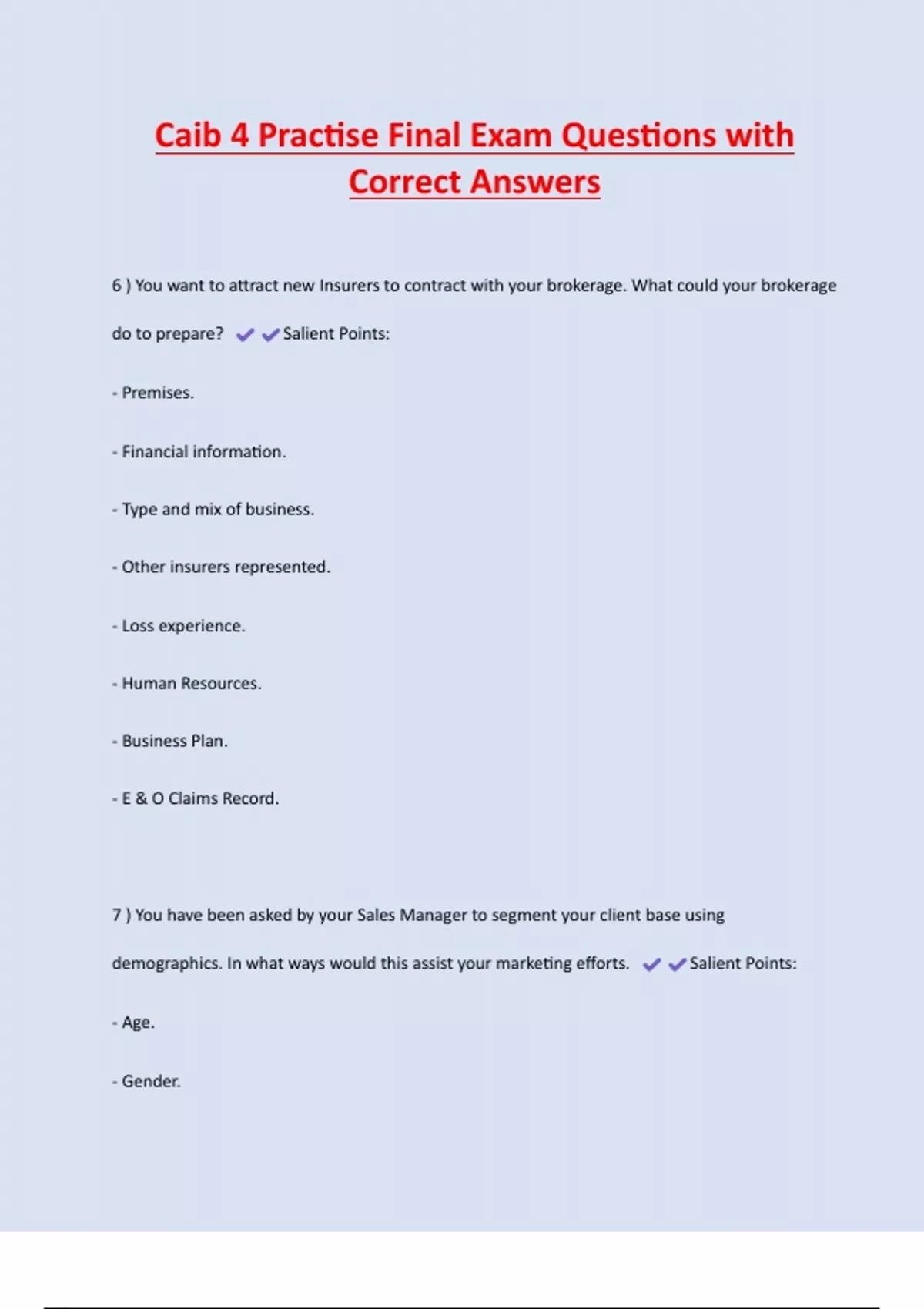 Caib 4 Practise Final Exam Questions with Correct Answers 6 ) You want to attract new Insurers to contract with your brokerage. What could your brokerage do to prepare? Salient Points: - Premises. - Financial information. - Type and mix of business. - Other insurers represented. - Loss experience. - Human Resources. - Business Plan. - E & O Claims Record.