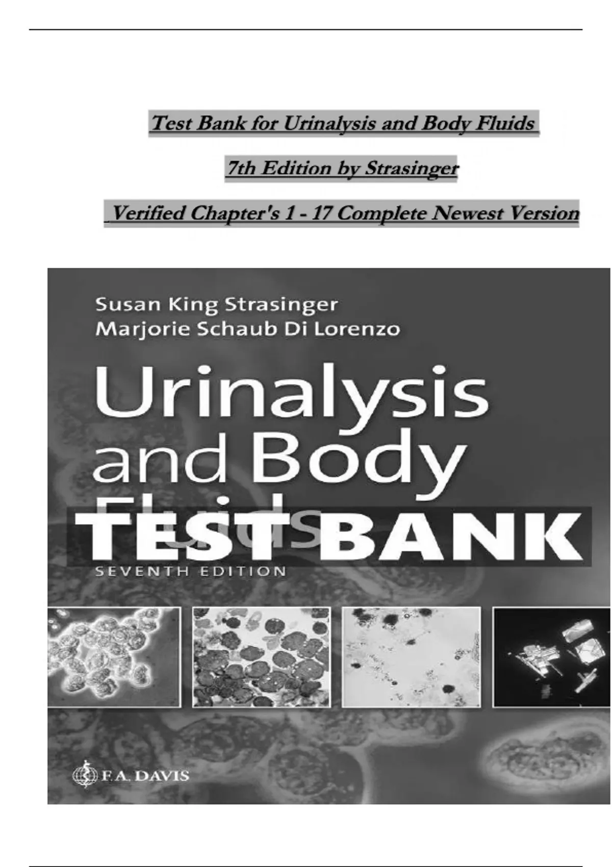 Test Bank For Urinalysis and Body Fluids, 7th Edition By Susan Strasinger|9780803675827| All Chapters 1-17| LATEST. A complete test bank that is ready to download in pdf format