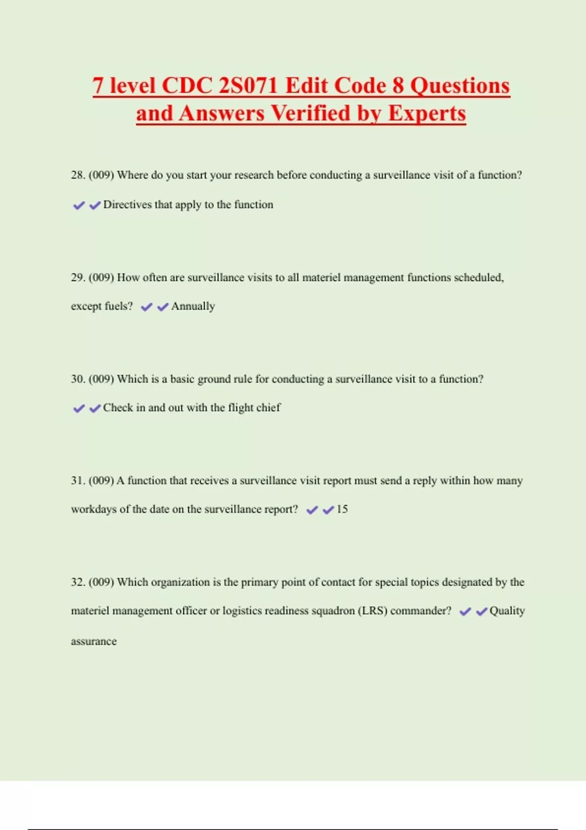 7 level CDC 2S071 Edit Code 8 Questions and Answers Verified by Experts 28. (009) Where do you start your research before conducting a surveillance visit of a function? Directives that apply to the function 29. (009) How often are surveillance visits to all materiel management functions scheduled, except fuels? Annually 30. (009) Which is a basic ground rule for conducting a surveillance visit to a function? Check in and out with the flight chief