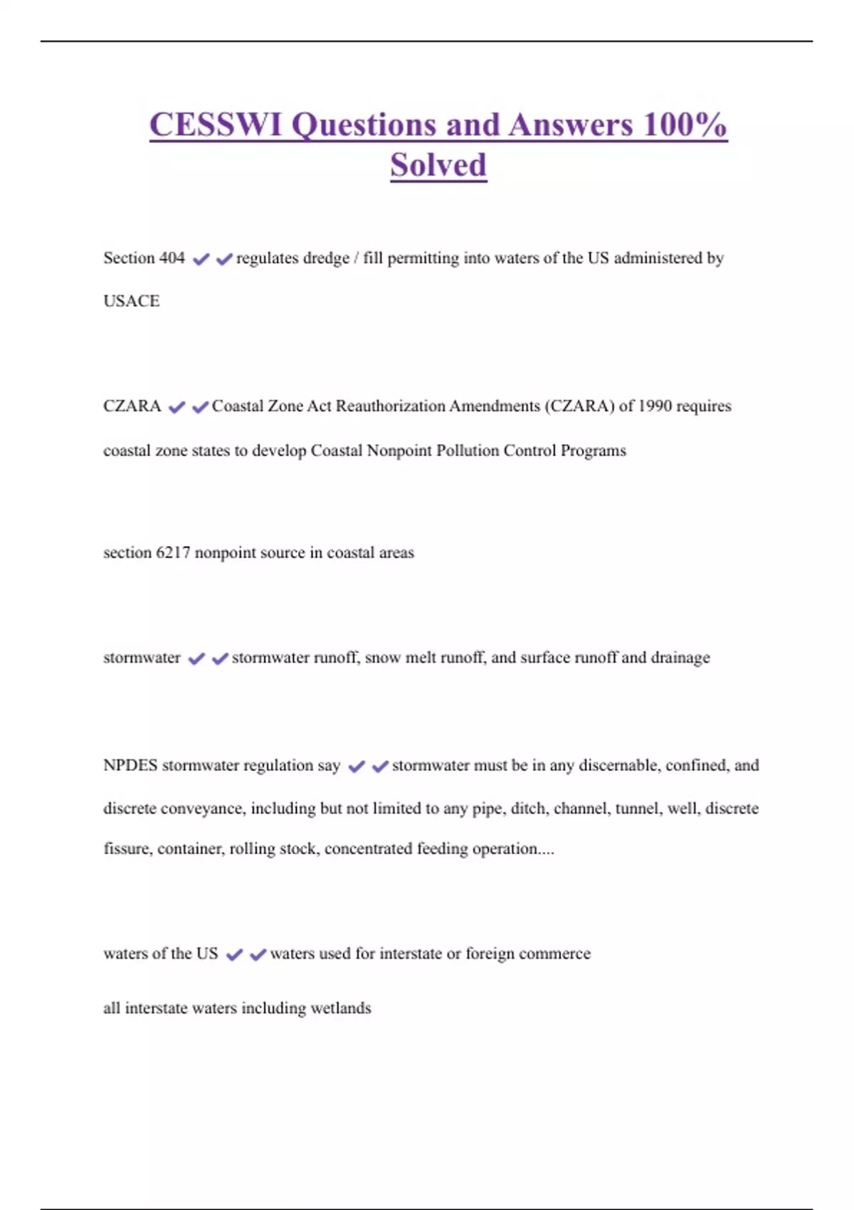 CESSWI Questions and Answers 100% Solved Section 404 regulates dredge / fill permitting into waters of the US administered by USACE CZARA Coastal Zone Act Reauthorization Amendments (CZARA) of 1990 requires coastal zone states to develop Coastal Nonpoint Pollution Control Programs