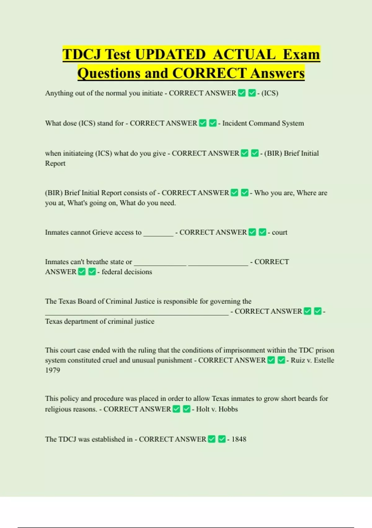 TDCJ Test UPDATED ACTUAL Exam Questions and CORRECT Answers Anything out of the normal you initiate - CORRECT ANSWER What dose (ICS) stand for - CORRECT ANSWER - (ICS) - Incident Command System when initiateing (ICS) what do you give - CORRECT ANSWER Report (BIR) Brief Initial Report consists of - CORRECT ANSWER you at, What's going on, What do you need. Inmates cannot Grieve access to ________ - CORRECT ANSWER - (BIR) Brief Initial - Who you are, Where