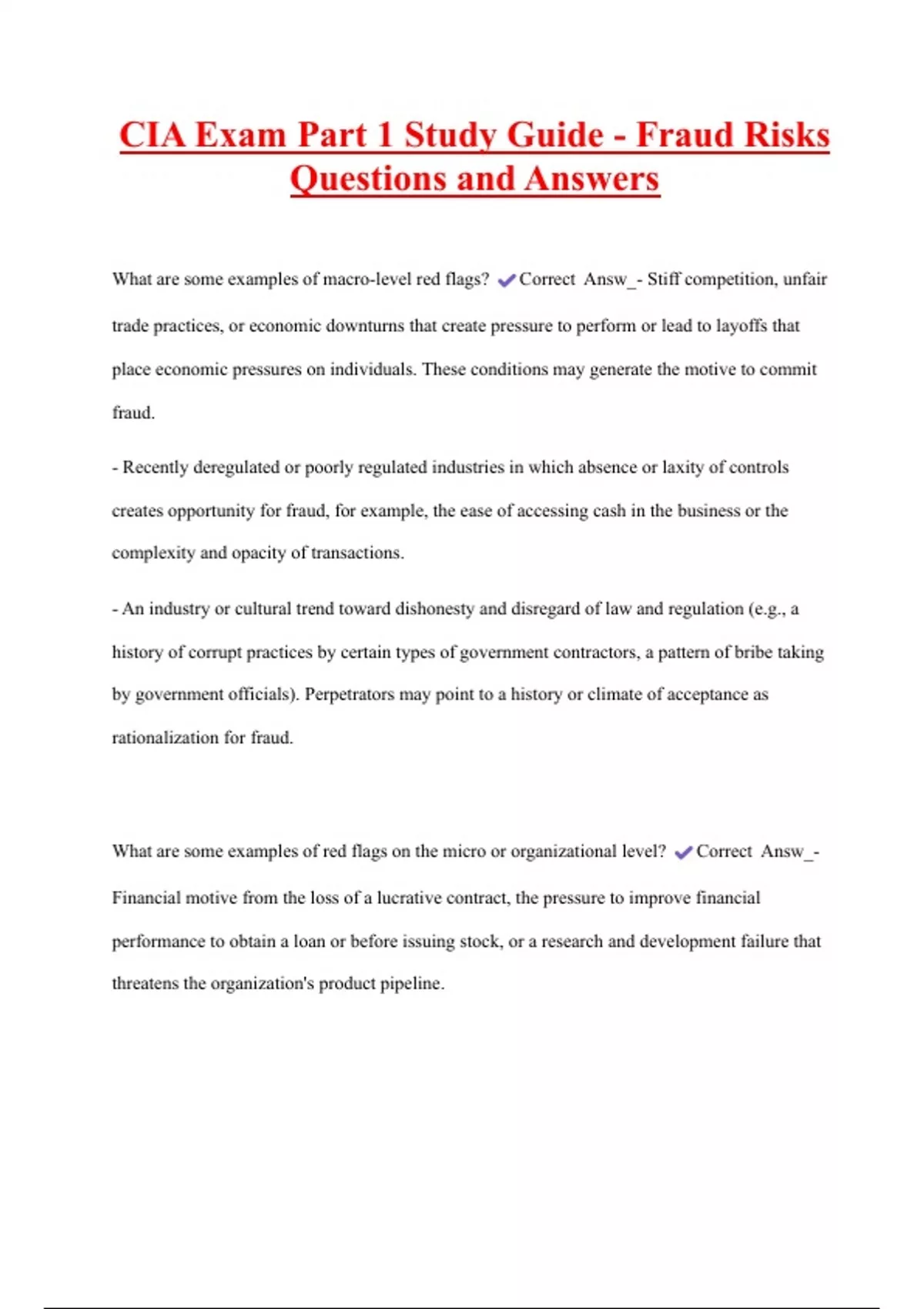 CIA Exam Part 1 Study Guide - Fraud Risks Questions and Answers What are some examples of macro-level red flags? Correct Answ_- Stiff competition, unfair trade practices, or economic downturns that create pressure to perform or lead to layoffs that place economic pressures on individuals. These conditions may generate the motive to commit fraud. - Recently deregulated or poorly regulated industries in which absence or laxity of controls creates opportunity for fraud, for example, the ease of accessing cash in the business or the complexity and opacity of transactions. - An industry or cultural trend toward dishonesty and disregard of law and regulation (e.g., a history of corrupt practices by certain types of government contractors, a pattern of bribe taking by government officials). Perpetrators may point to a history or climate of acceptance as rationalization for fraud.