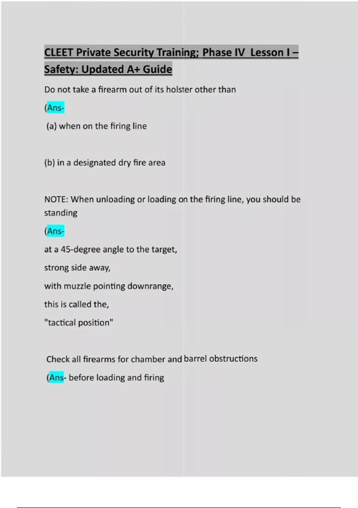 Do not take a firearm out of its holster other than (Ans- (a) when on the firing line (b) in a designated dry fire area NOTE: When unloading or loading on the firing line, you should be standing (Ansat a 45-degree angle to the target, strong side away, with muzzle pointing downrange, this is called the, "tactical position" Check all firearms for chamber and barrel obstructions (Ans- before loading and firingCAUTION: never leave cleaning patches in the (Anscylinder, chamber, or barrel Never place your finger on the trigger until the firearm is (Ansclear of the holster, and is pointed downrange NOTE: the trigger finger is the "primary safety" as such, it should remain outside the trigger guard until (Ansthe firearm is pointed down range, and the target has been identified