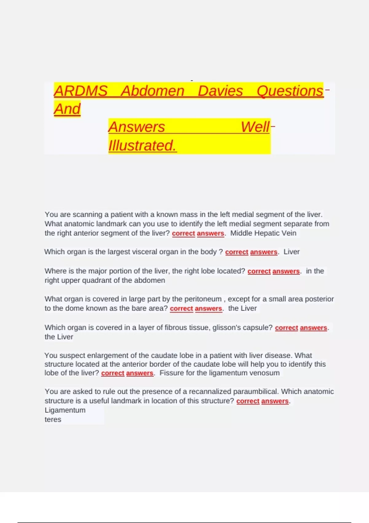 You are scanning a patient with a known mass in the left medial segment of the liver. What anatomic landmark can you use to identify the left medial segment separate from the right anterior segment of the liver? correct answers. Middle Hepatic Vein Which organ is the largest visceral organ in the body ? correct answers. Liver Where is the major portion of the liver, the right lobe located? correct answers. in the right upper quadrant of the abdomen What organ is covered in large part by the peritoneum , except for a small area posterior to the dome known as the bare area? correct answers. the Liver Which organ is covered in a layer of fibrous tissue, glisson's capsule? correct answers. the Liver You suspect enlargement of the caudate lobe in a patient with liver disease. What structure located at the anterior border of the caudate lobe will help you to identify this lobe of the liver? correct answers. Fissure for the ligamentum venosum You are asked to rule out the presence of a recannalized paraumbilical. Which anatomic structure is a useful landmark in location of this structure? correct answers. Ligamentum teres What is the left portal vein in contact with? correct answers. Ligamentum teres