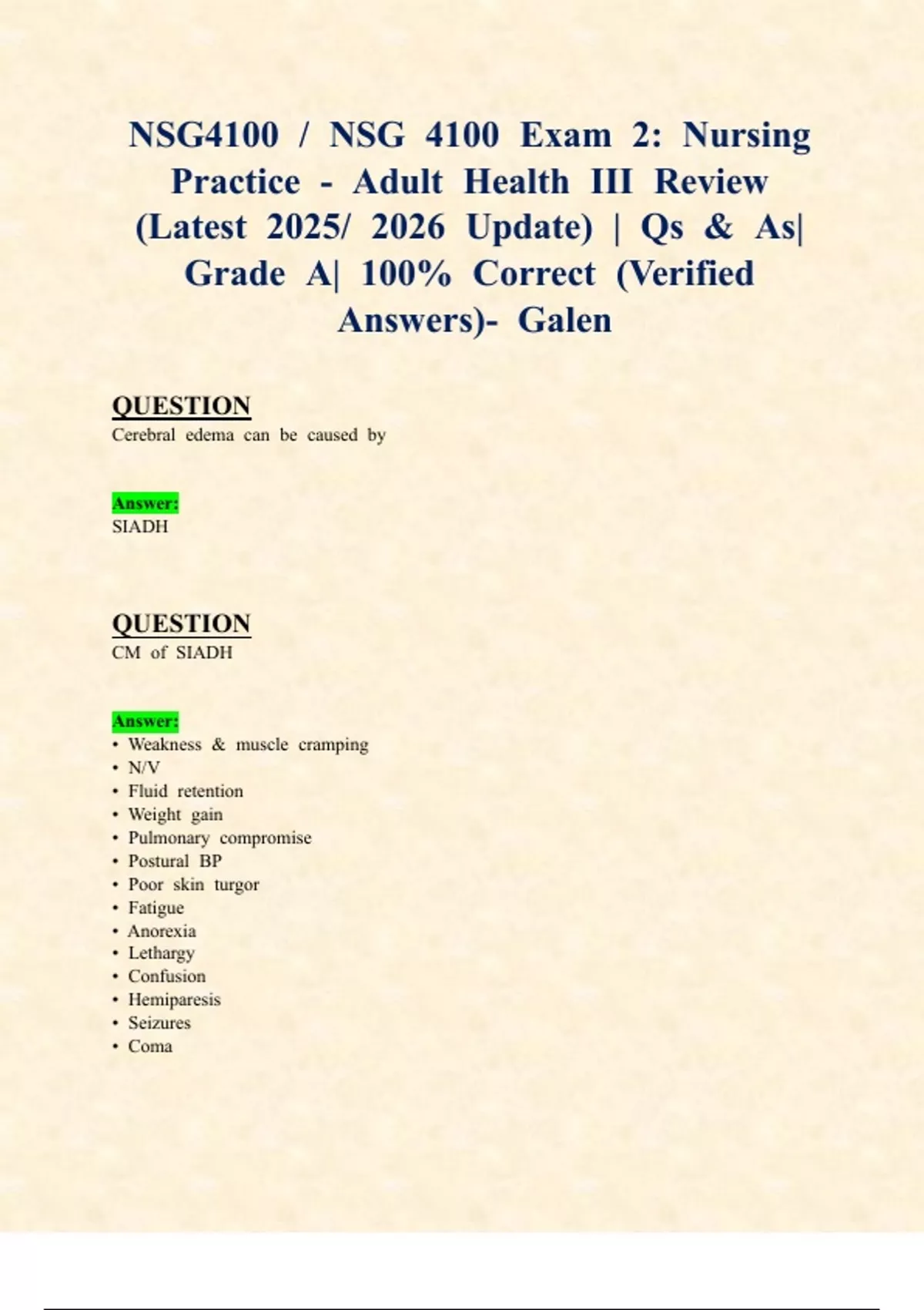 NSG4100 / NSG 4100 Exam 2: Nursing Practice - Adult Health III Review (Latest 2025/ 2026 Update) | Qs & As| Grade A| 100% Correct (Verified Answers)- Galen