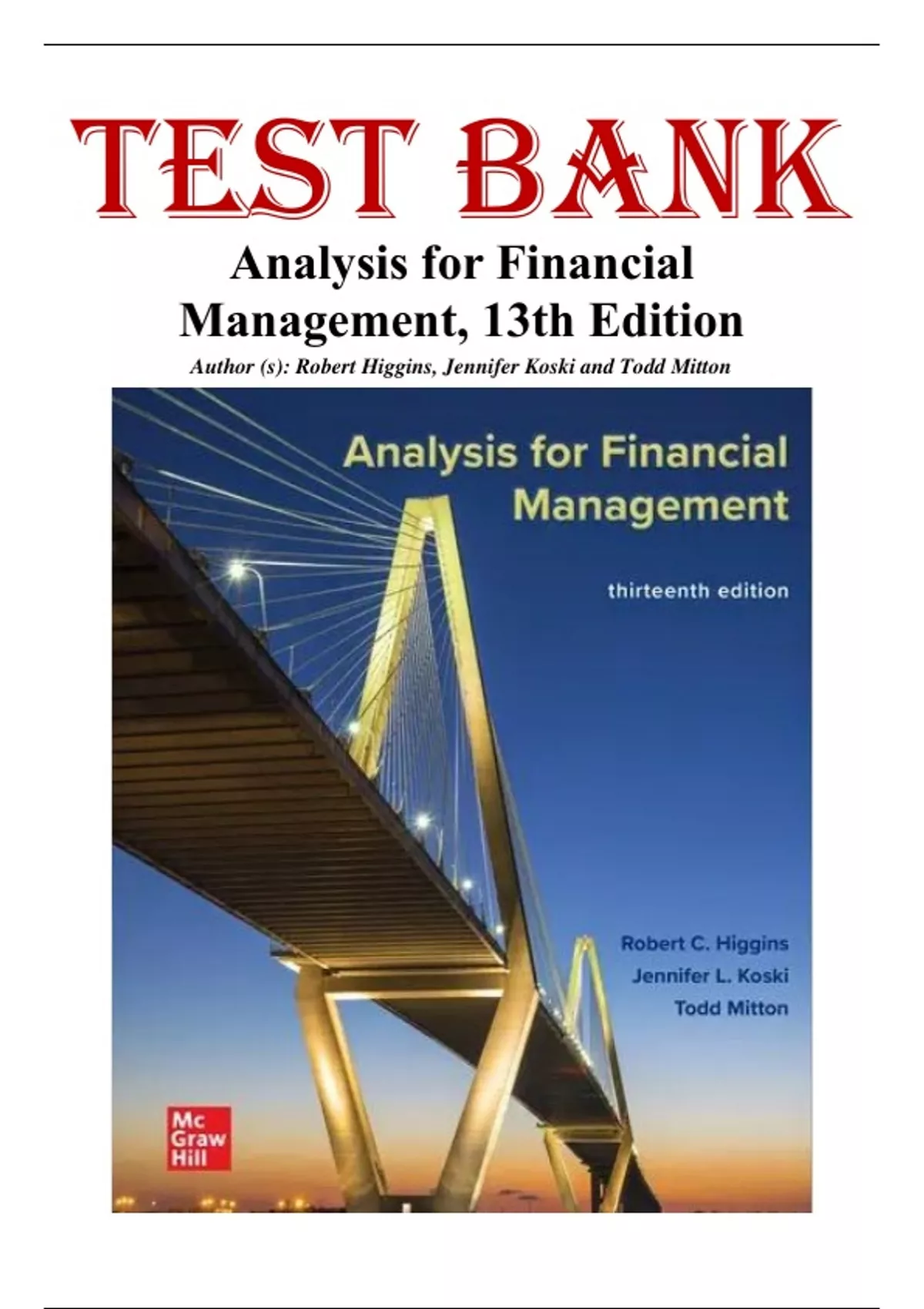 Test Bank for Analysis for Financial Management, 13th Edition by Robert C. Higgins. Full Chapters Include;.....1. Interpreting Financial Statements. 2. Evaluating Financial Performance. 3. Financial Forecasting. 4. Managing Growth. 5. Financial Instruments and Markets. 6. The Financing Decision. 7. Discounted Cash Flow Techniques. 8. Risk Analysis in Investment Decisions. 9. Business Valuation and Corporate Restructuring.