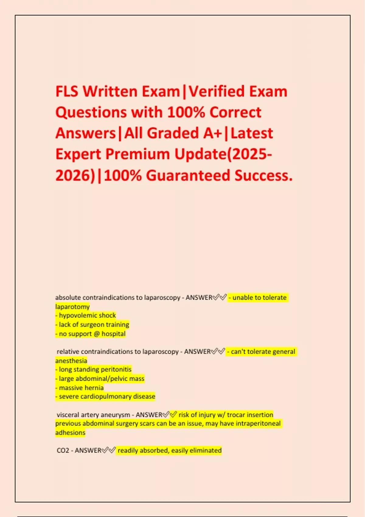 FLS Written Exam|Verified Exam Questions with 100% Correct Answers|All Graded A+|Latest Expert Premium Update()|100% Guaranteed Success. absolute contraindications to laparoscopy - ANSWER - unable to tolerate laparotomy - hypovolemic shock - lack of surgeon training - no support @ hospital relative contraindications to laparoscopy - ANSWER - can't tolerate general anesthesia - long standing peritonitis - large abdominal/pelvic mass - massive hernia - severe cardiopulmonary disease visceral artery aneurysm - ANSWER risk of injury w/ trocar insertion previous abdominal surgery scars can be an issue, may have intraperitoneal adhesions CO2 - ANSWER readily absorbed, easily eliminated