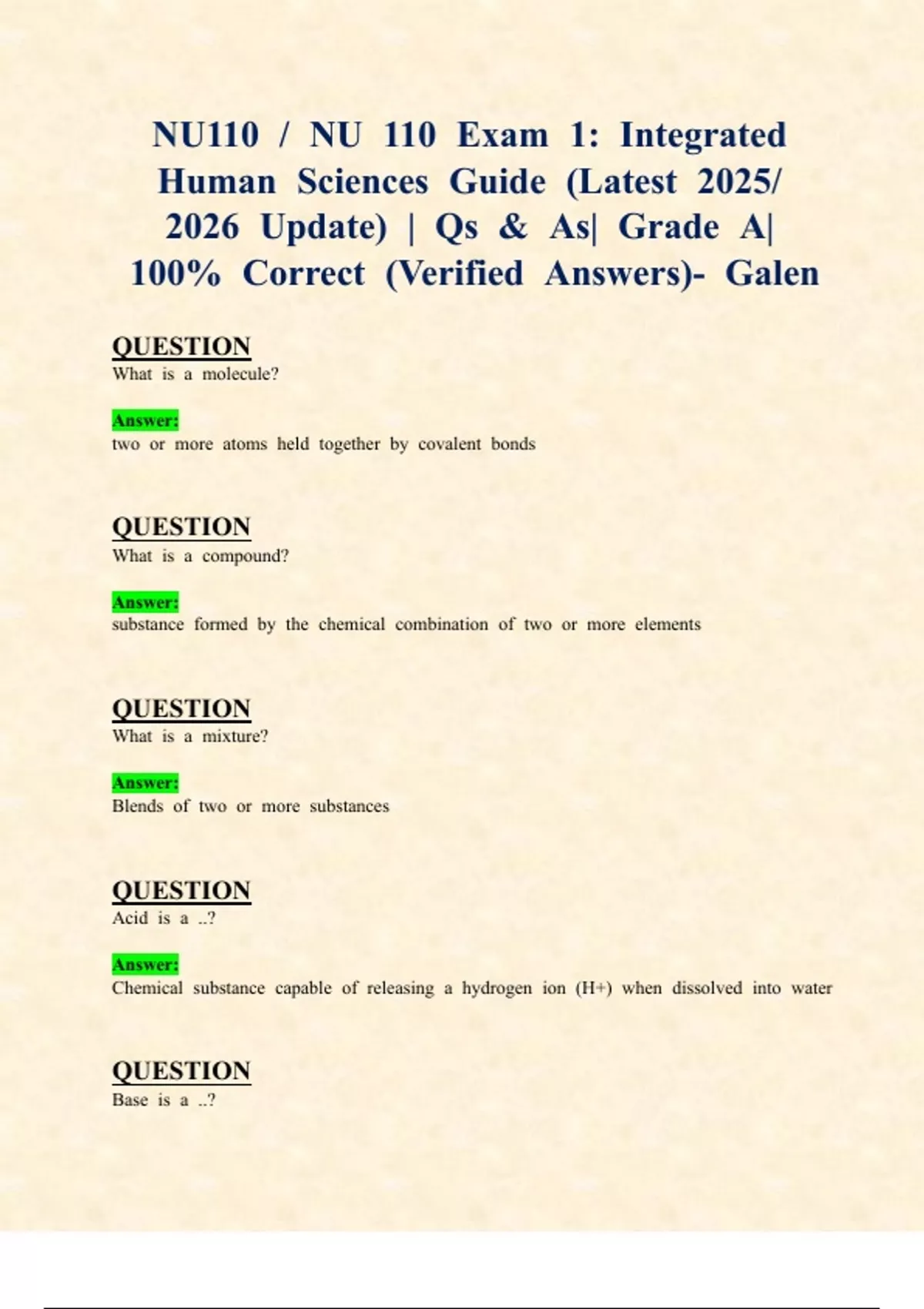 NU110 / NU 110 Exam 1: Integrated Human Sciences Guide (Latest 2025/ 2026 Update) | Qs & As| Grade A| 100% Correct (Verified Answers)- Galen