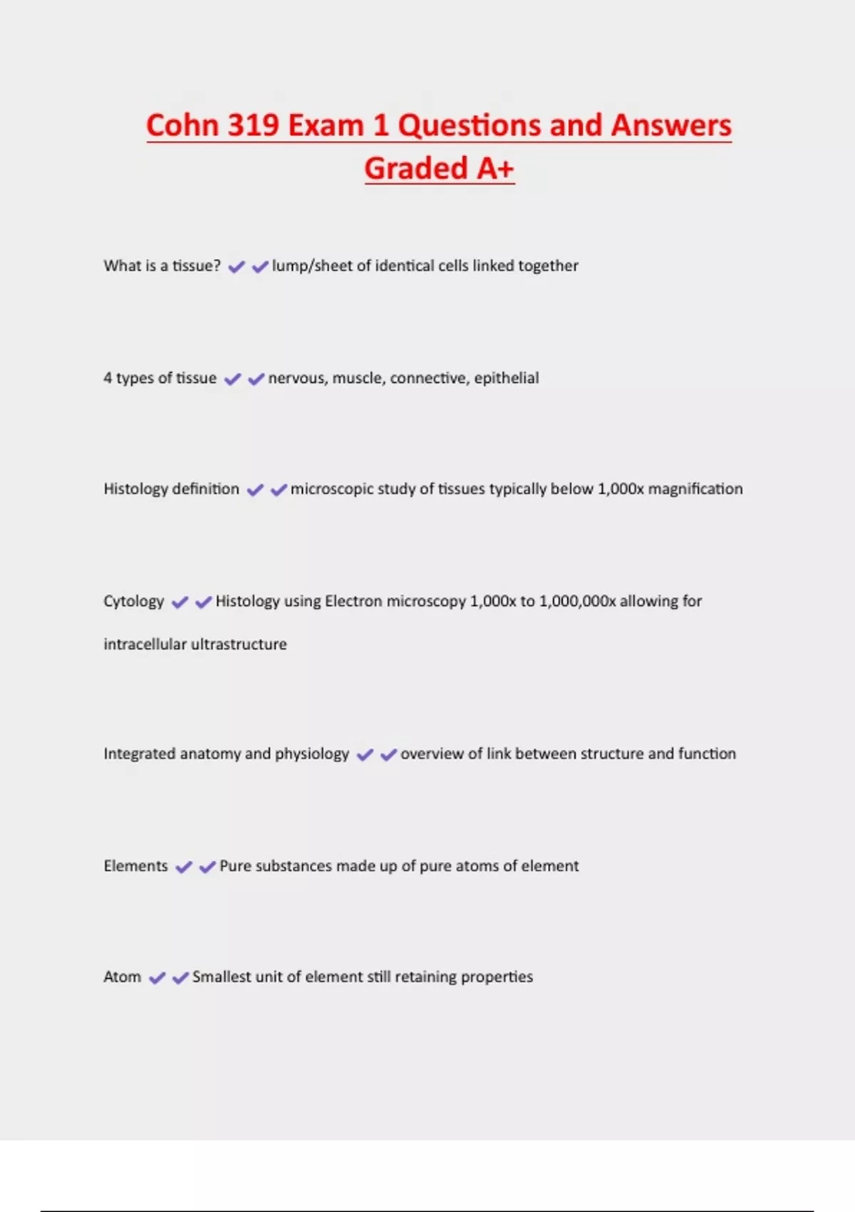 Cohn 319 Exam 1 Questions and Answers Graded A+ What is a tissue? lump/sheet of identical cells linked together 4 types of tissue nervous, muscle, connective, epithelial Histology definition microscopic study of tissues typically below 1,000x magnification Cytology Histology using Electron microscopy 1,000x to 1,000,000x allowing for intracellular ultrastructure