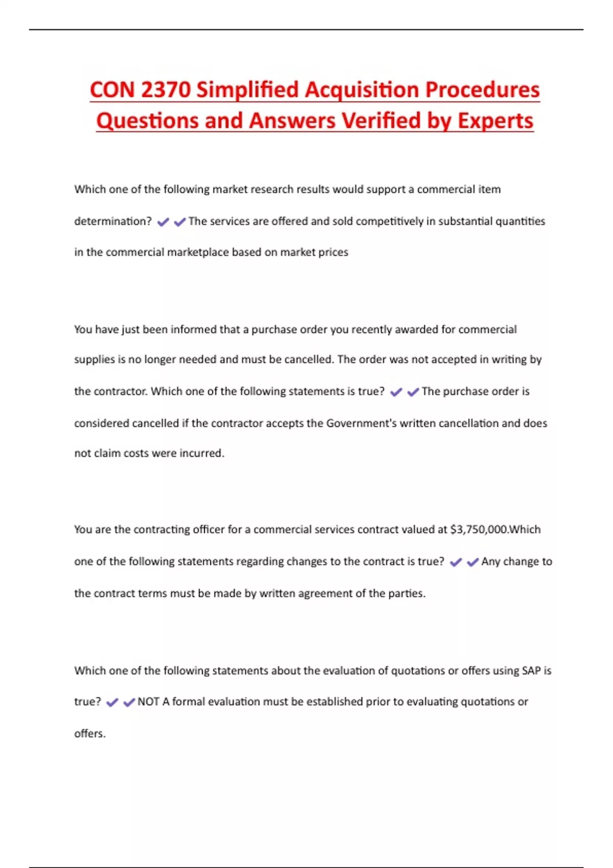 CON 2370 Simplified Acquisition Procedures Questions and Answers Verified by Experts Which one of the following market research results would support a commercial item determination? The services are offered and sold competitively in substantial quantities in the commercial marketplace based on market prices You have just been informed that a purchase order you recently awarded for commercial supplies is no longer needed and must be cancelled. The order was not accepted in writing by the contractor. Which one of the following statements is true? The purchase order is considered cancelled if the contractor accepts the Government's written cancellation and does not claim costs were incurred.