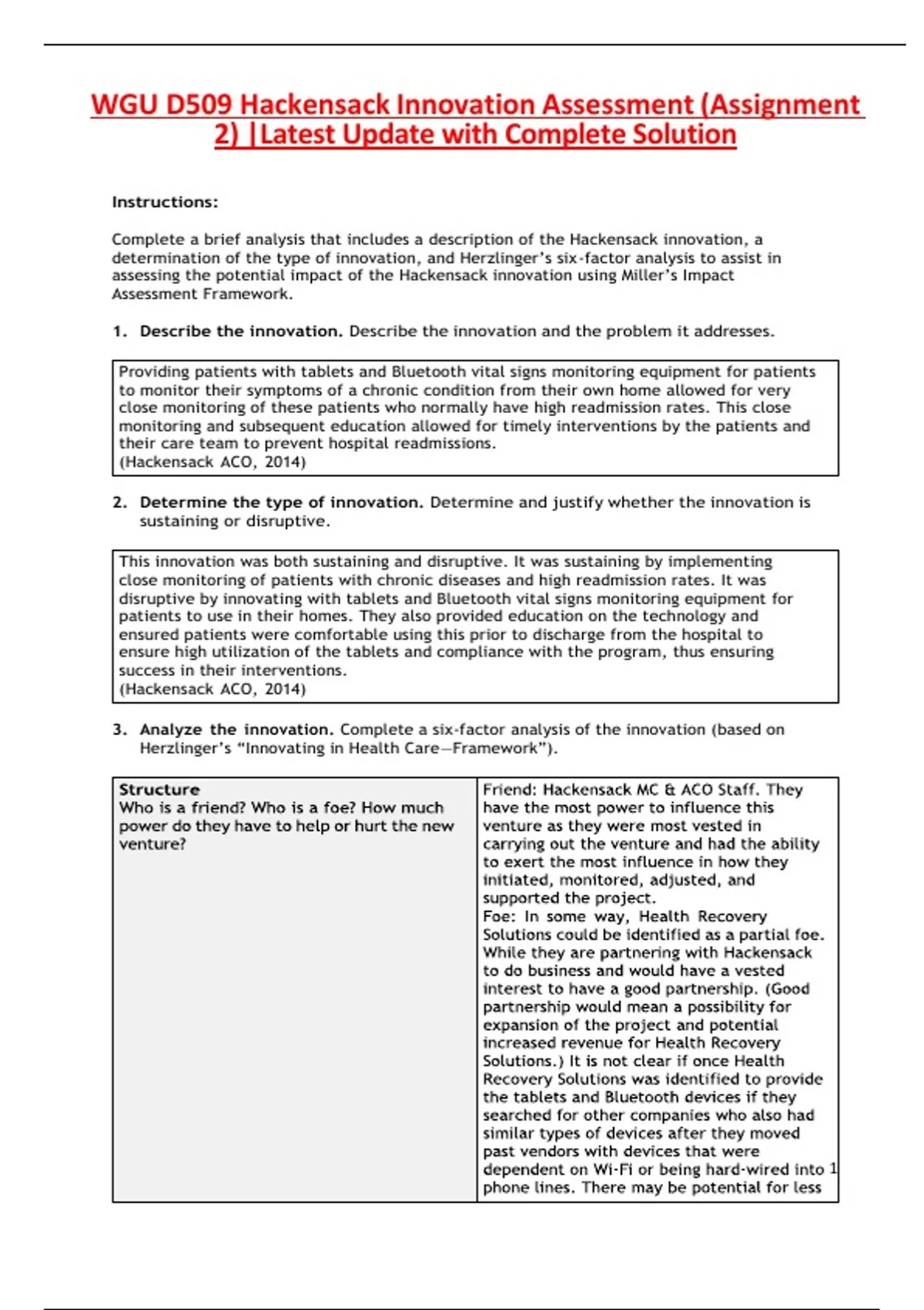 Complete a brief analysis that includes a description of the Hackensack innovation, a