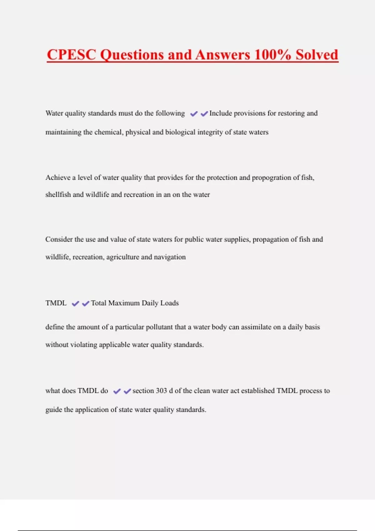 CPESC Questions and Answers 100% Solved Water quality standards must do the following Include provisions for restoring and maintaining the chemical, physical and biological integrity of state waters Achieve a level of water quality that provides for the protection and propogration of fish, shellfish and wildlife and recreation in an on the water Consider the use and value of state waters for public water supplies, propagation of fish and wildlife, recreation, agriculture and navigation