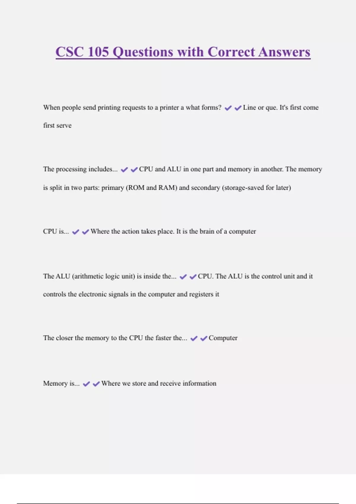 CSC 105 Questions with Correct Answers When people send printing requests to a printer a what forms? Line or que. It's first come first serve The processing includes... CPU and ALU in one part and memory in another. The memory is split in two parts: primary (ROM and RAM) and secondary (storage-saved for later)